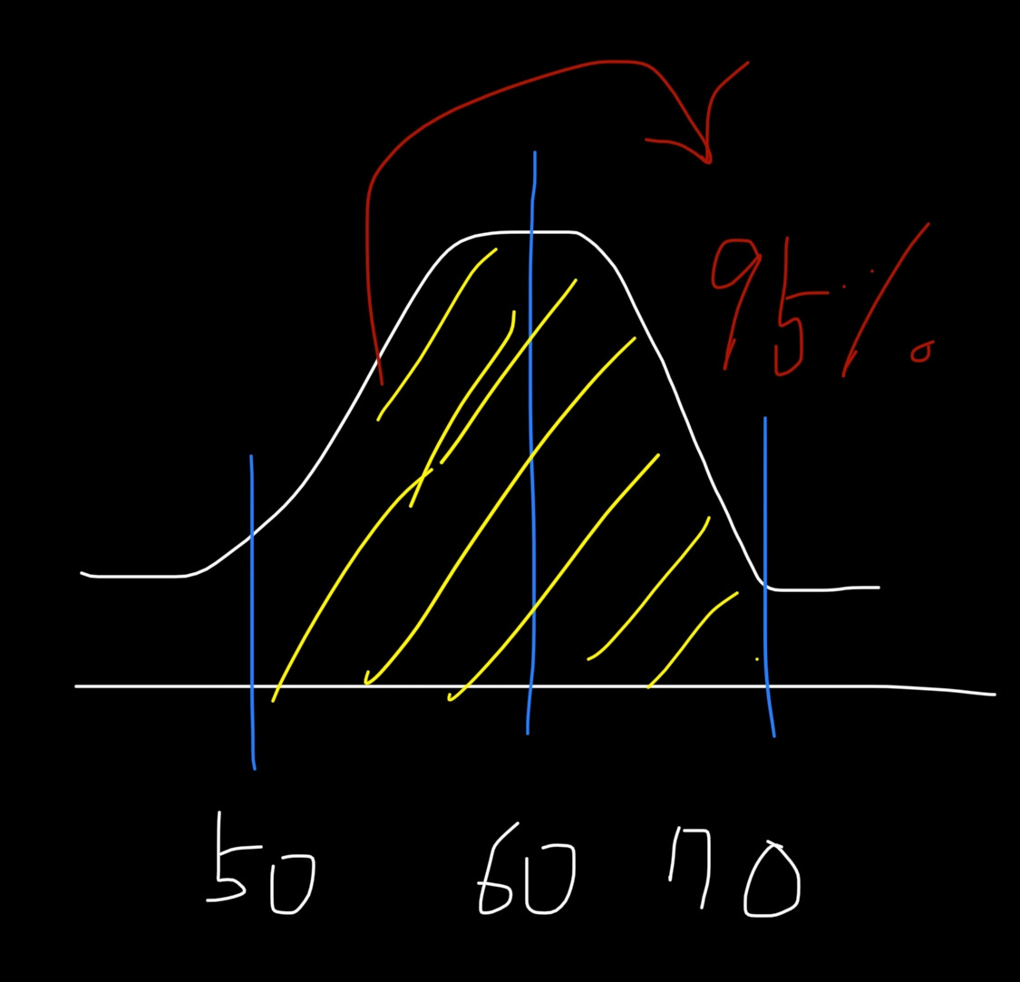 한 부모가 있어 멀리 떨어져 살고 있는 딸이 평균 시속 100킬로미터로 운전해서 귀향하겠다고 전화가 왔다고 가정하자. 마침 집이 정확하게 100킬로미터 거리여서 예상 소요시간이 1시간이 되는 상황이다. 또한, 그 부모는 워낙 해당 길을 잘 알고 우연히 통계 천재라서 이런저런 돌발적인 상황을 고려해 직관적으로 소요시간의 표준편차를 계산할 수 있다고 가정하자. 예를들어 길이 막히는 구간이 있어 다른 길을 선택한다던가 한다면 아무리 평균 100킬로미터로 운전해도 절대거리가 늘어날테니깐 말이다. 이렇게 평균과 표준편차를 알고 대충 정규분포 비슷하다고 가정하면 다음과 같은 그림이 나올 것이다 (아이폰으로 글 쓰면서 손가락으로 간단하게 그림).