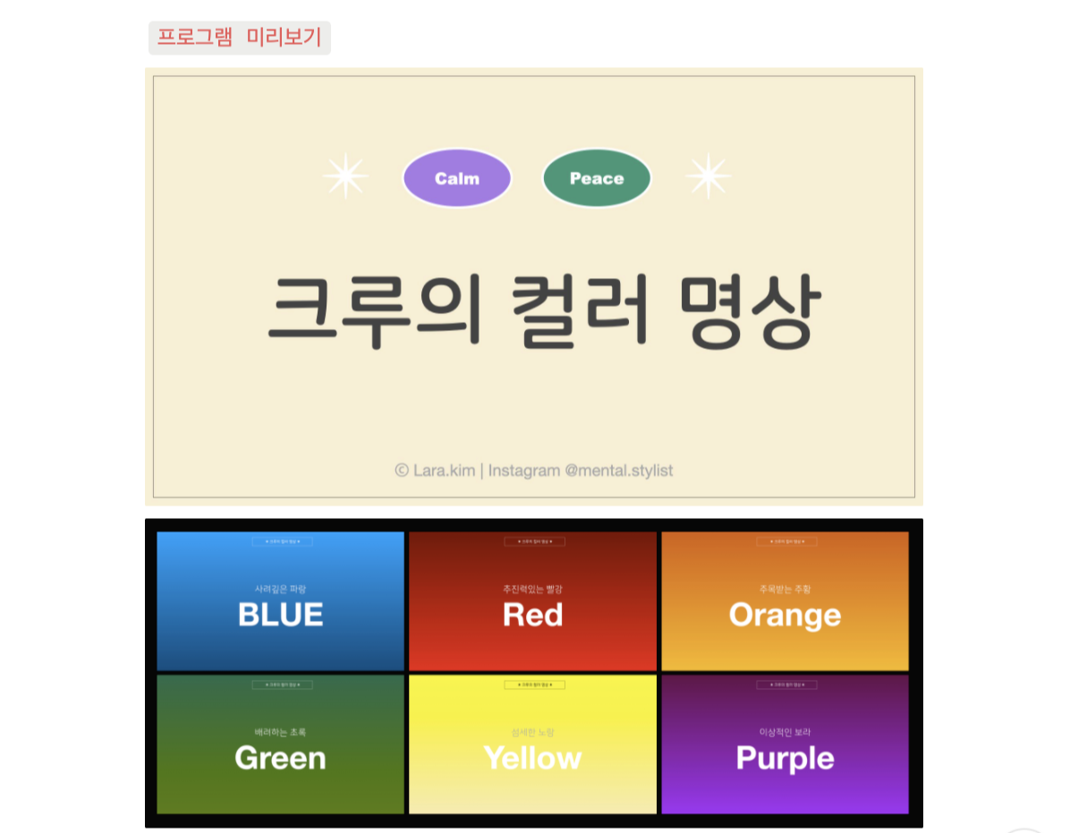 <크루의 컬러 명상>은 제가 배우고 있는 미술치료적 요소를 마음챙김 명상에 접목시켜 개발한 프로그램입니다.