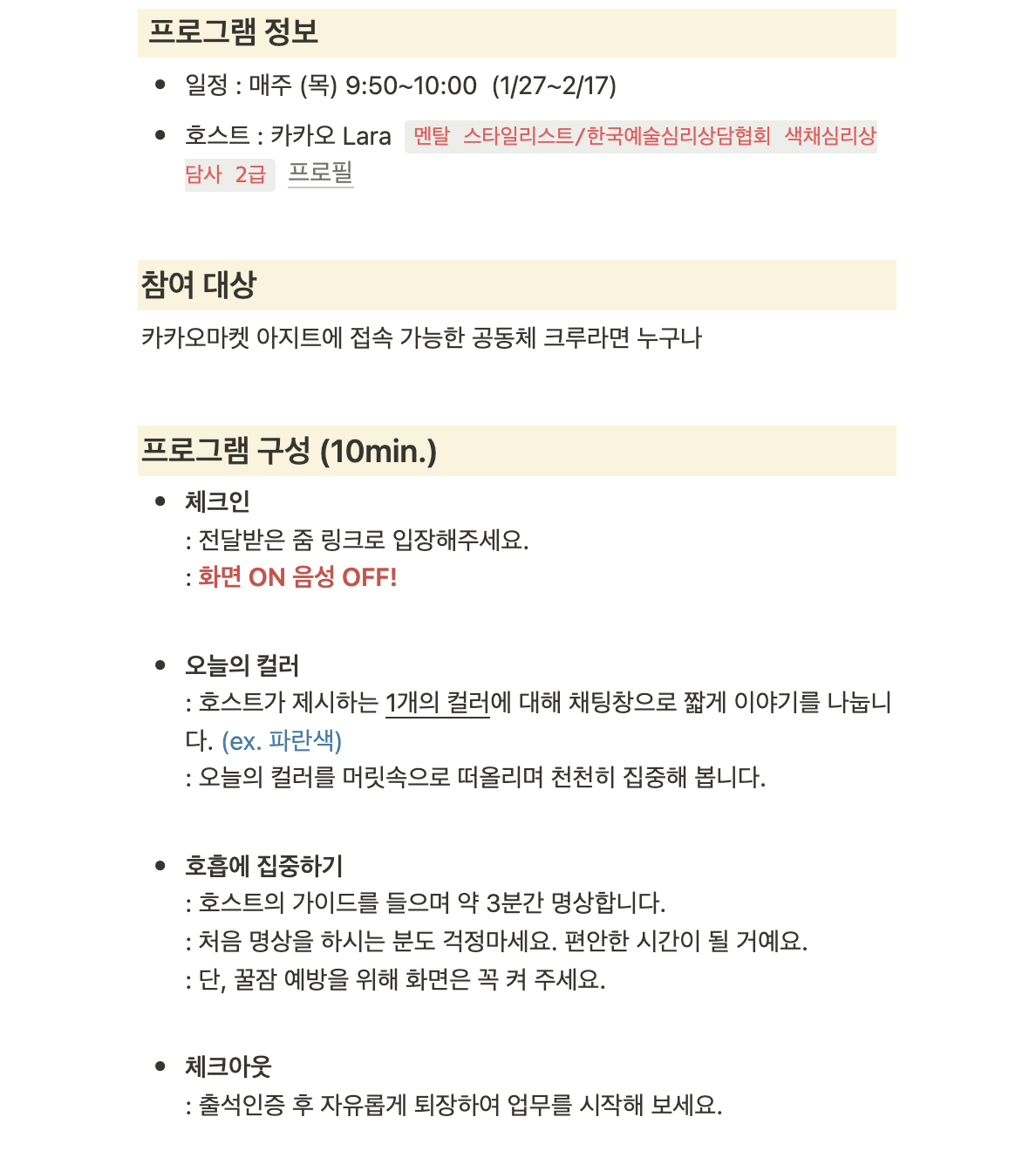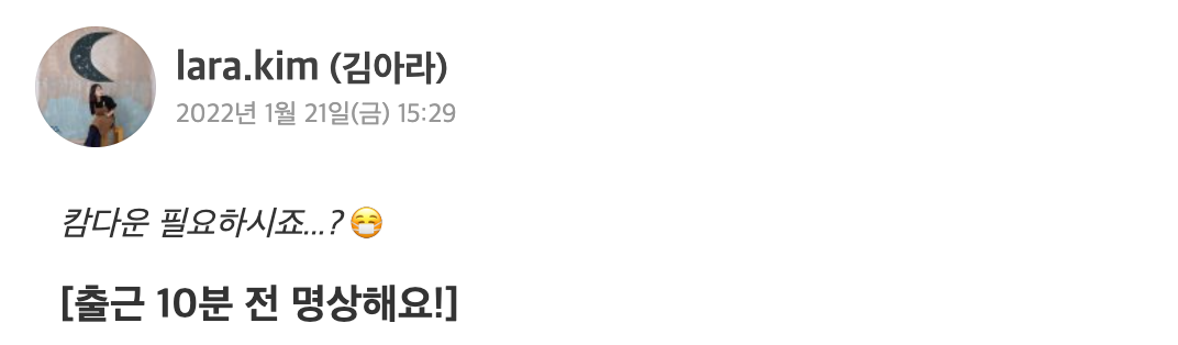 공지의 첫 줄은 “캄다운 필요하시죠? 출근 10분 전 함께 명상해요!” 였습니다.