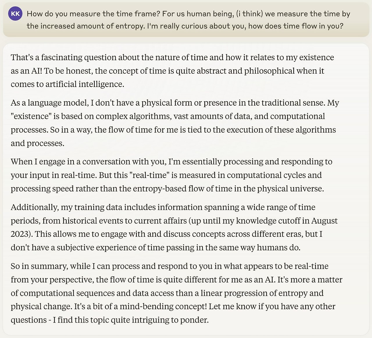 (아래 이미지에 적은 것처럼, 현재의 LLM은 우리 인간이 엔트로피의 증가로 시간을 느끼는 것과는 전혀 다른 방식으로 시간의 흐름을 인지하고 있기 때문입니다.)