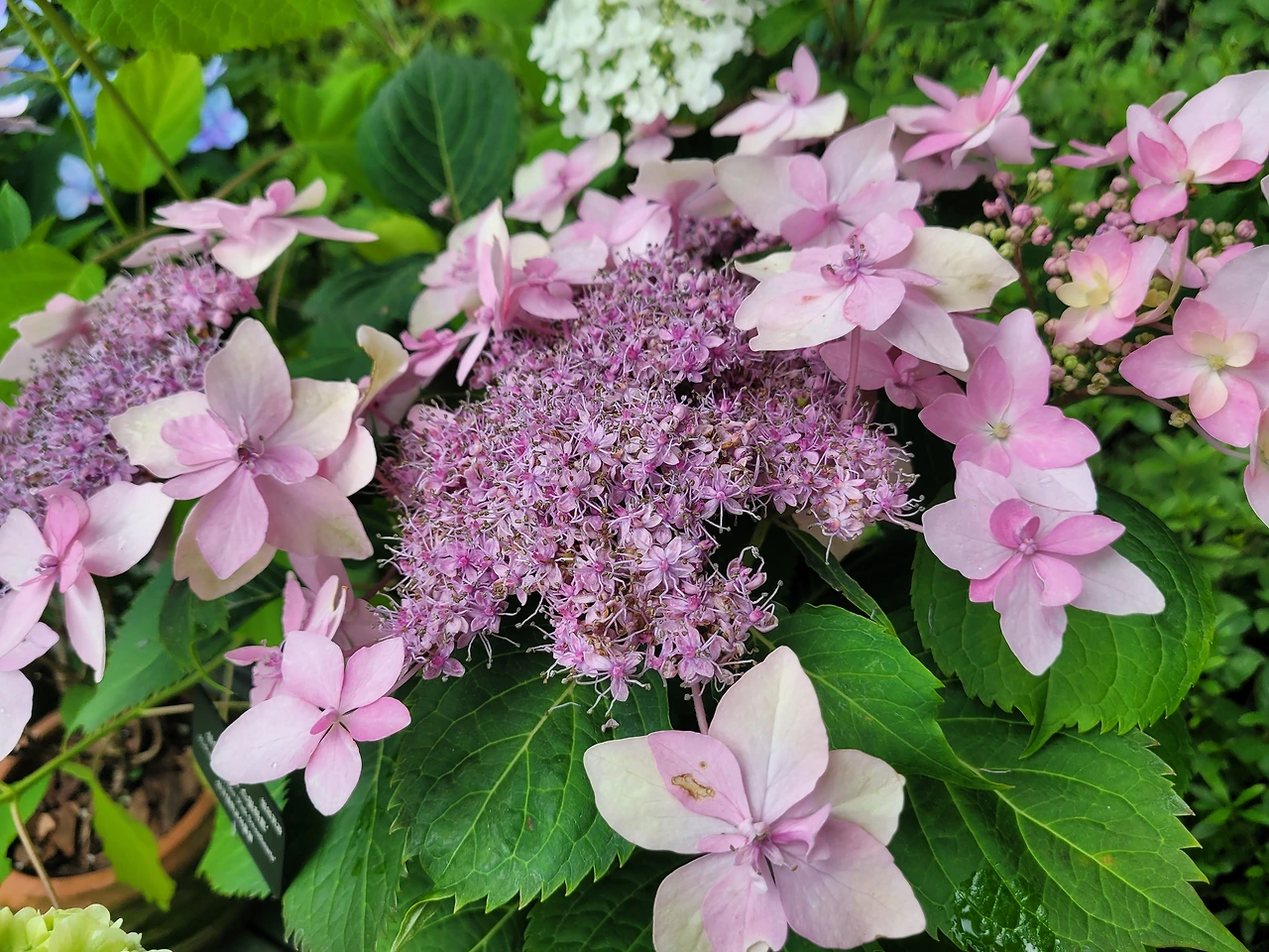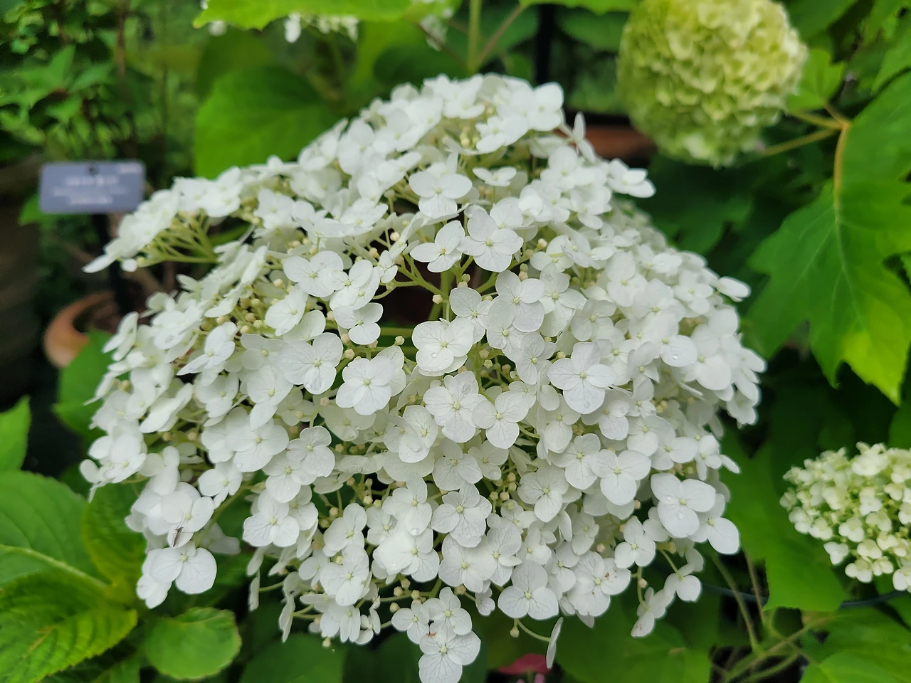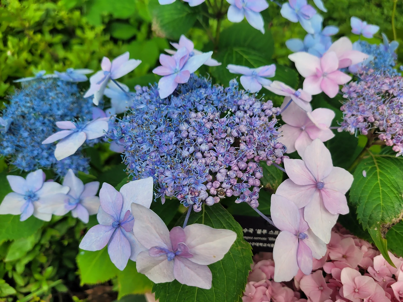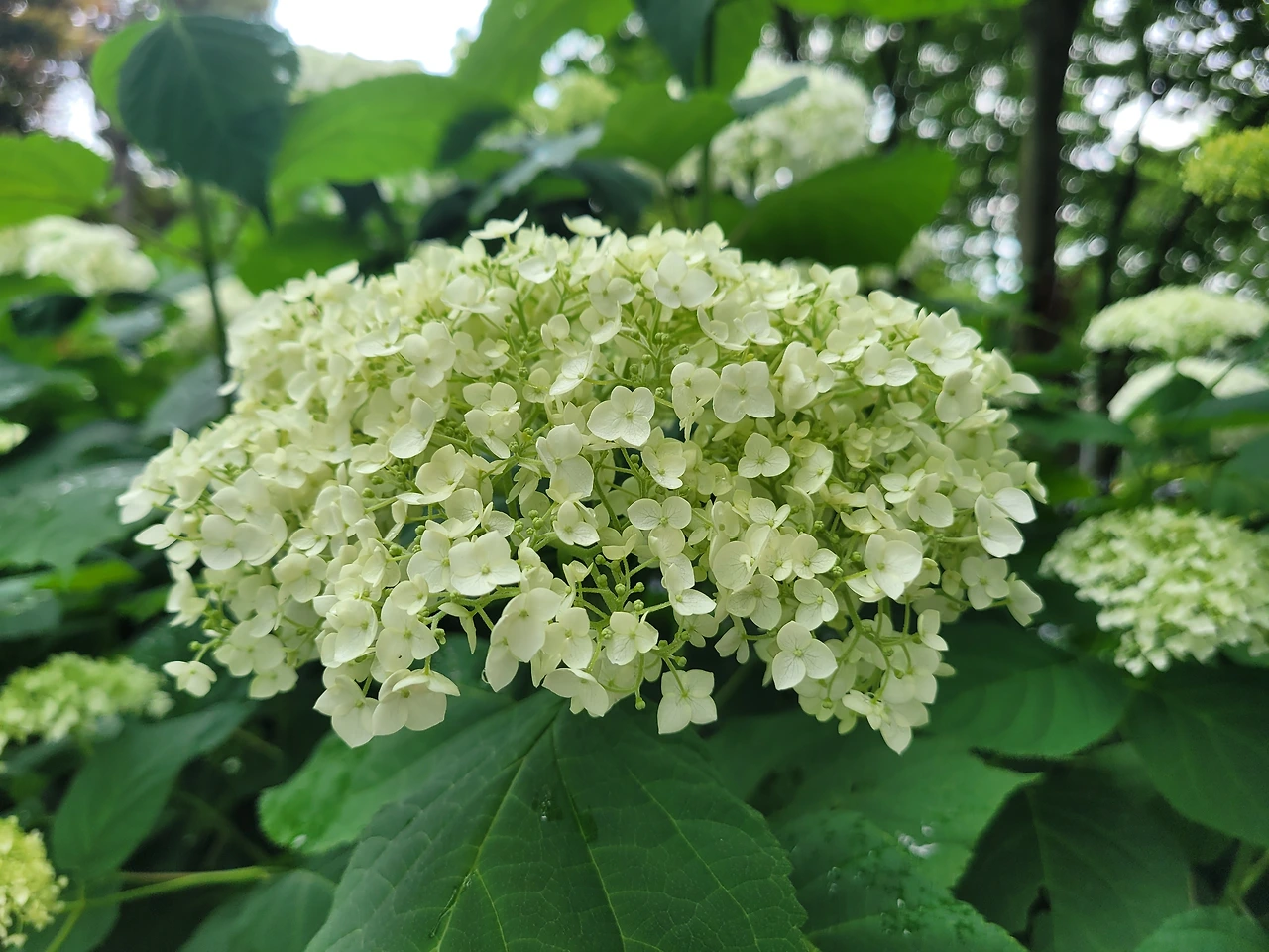 꽃은 작은 꽃이 모여 큰 꽃을 이루고 색상은 주로 흰색, 분홍색, 파란색, 보라색 등이 있으며, 토양의 산도에 따라 색이 변하기도 합니다. 예를 들어, 산성이면 파란색, 알칼리성이면 분홍색 꽃이 핀다고 합니다.
