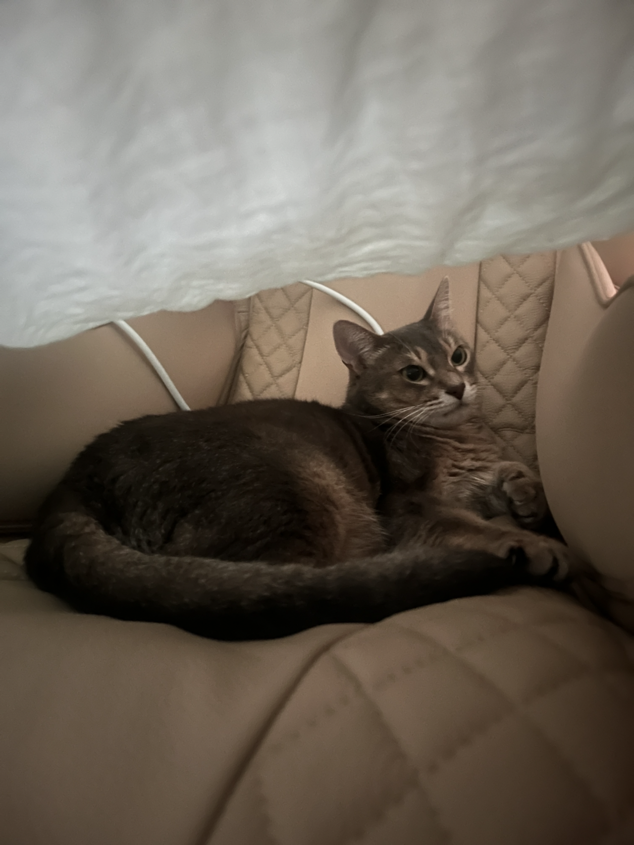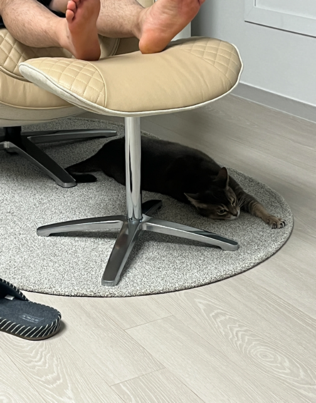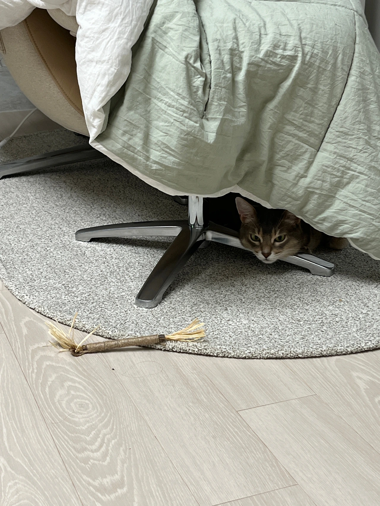 쭈욱 긴 몸을 뻗어 스트레칭도 하고 안마의자 다리 사이에 숨겨지지 않은 본인의 큰 몸을 숨겨 사냥놀이도 한다.