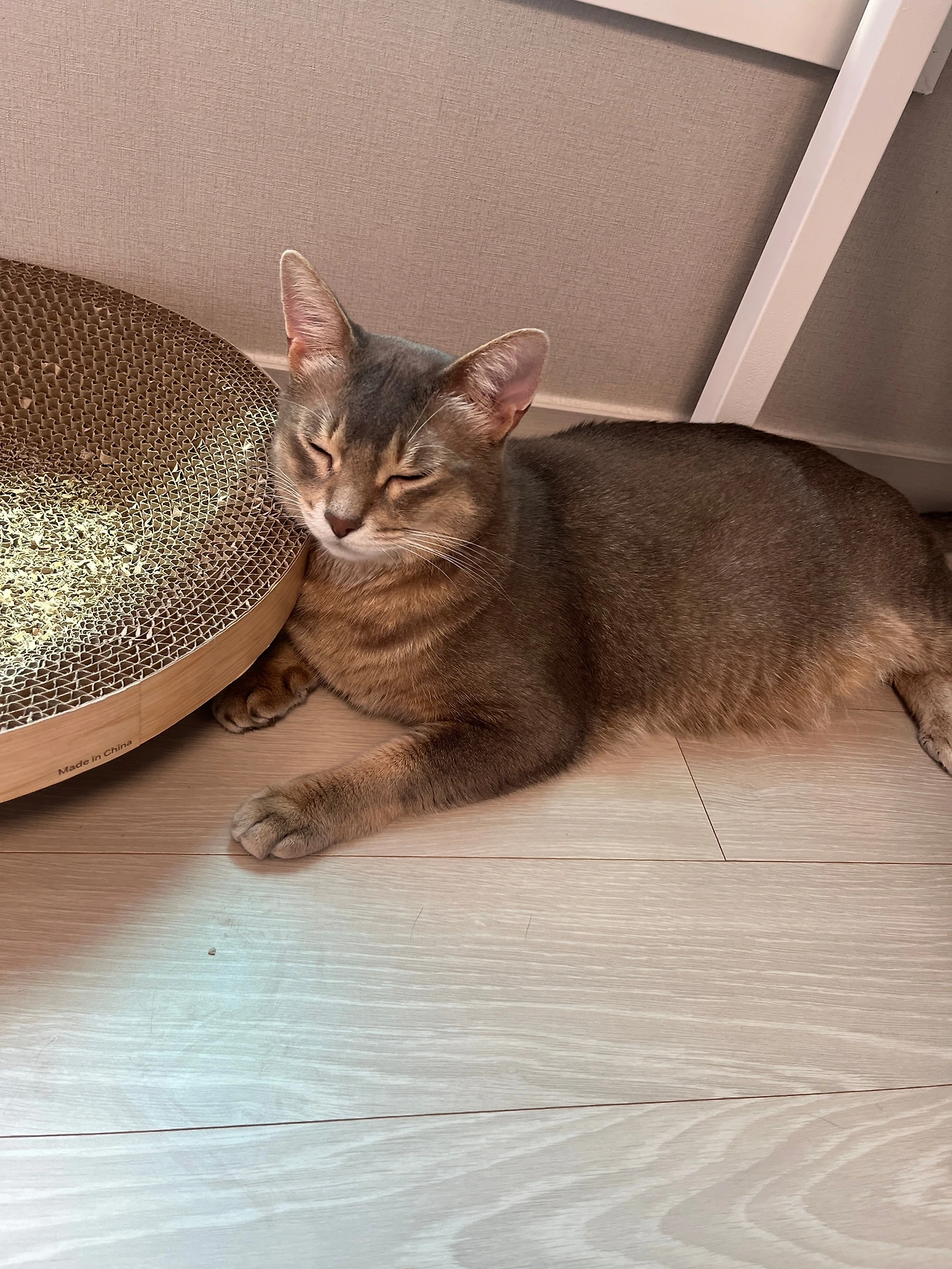 눈까지 감고 모서리 부분에 집중적으로 뺨을 비비며 눈을 감고 시원해하는 냥이.