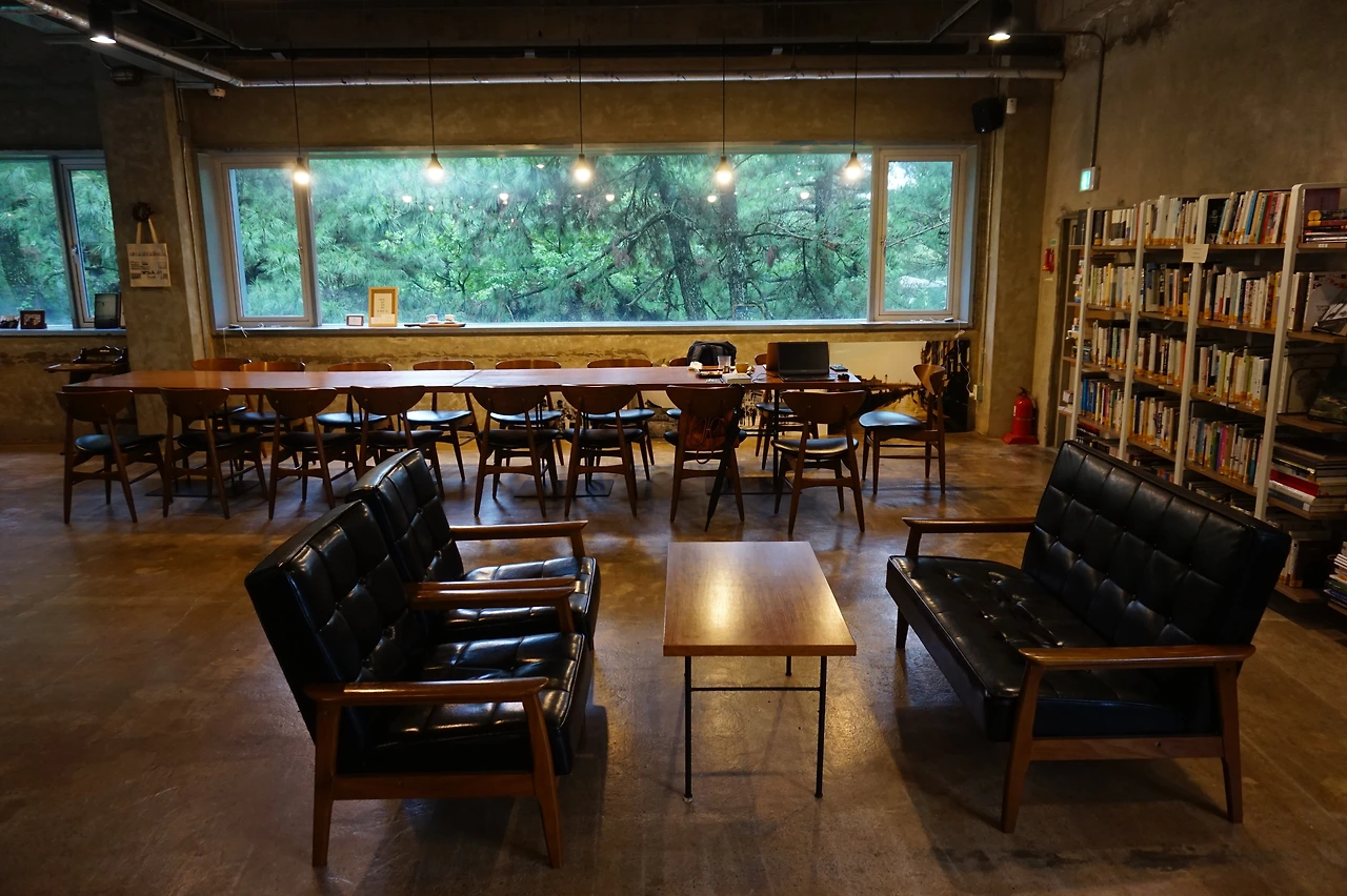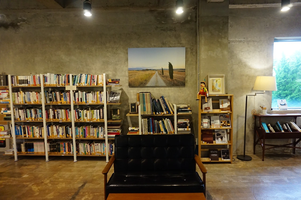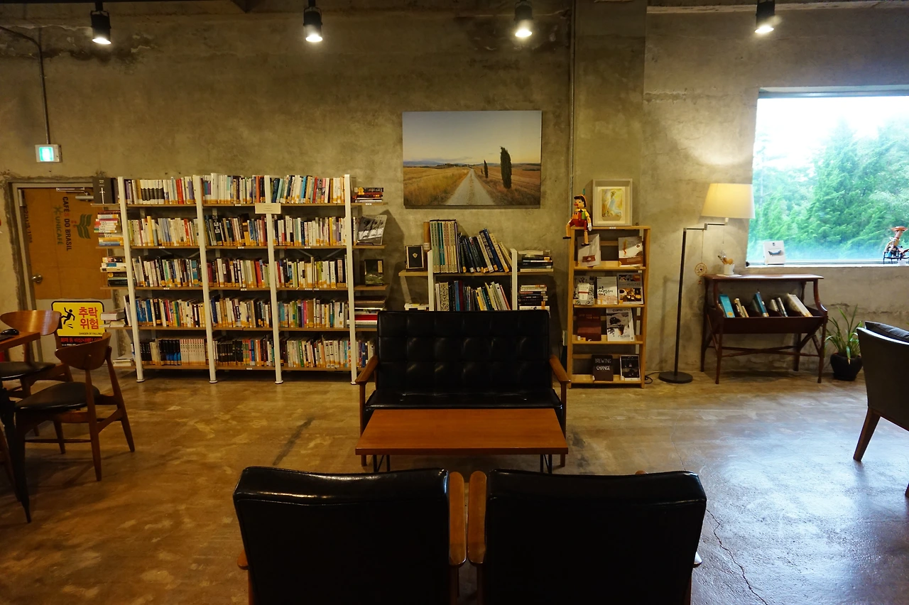도로에서 한참을 안으로 들어가면 나무들 사이로 적갈색 벽돌로 지어진 단정한 건물이 모습을 드러낸다. 여기는 외관도, 내부 공간도 모두 숲에 싸여있는 분위기인데, 한마디로 숲을 마음껏 즐기도록 만들어진 공간이다. 긴 통창과 작은 창문들도 모두 주변의 나무를 더 가까이 볼 수 있도록 설계되어 있고, 실내 공간 옆에는 테라스 공간을 크게 따로 내어 야외에 앉아 있는 듯한 기분을 충분히 낼 수 있다. 전망을 제대로 즐길 수 있는 옥상 공간도 따로 있다. 카페 내부에는 해외의 여행지들을 찍은 사진들이 중간중간에 걸려 있고, 다양한 크기와 색깔의 의자와 테이블이 놓여있어 지루하지 않고 다채로운 분위기를 만들어낸다. 단지 인테리어를 위한 것이 아닌, 정말 읽으라고 둔 책들-만화책 포함-이 잔뜩 꽂혀있는 책장도 있었다. 여기에 와서는 제대로 푹 쉬다 가라고, 이 공간을 지은 이가 내게 말을 건네는 것만 같았다. 그렇다, 나는 오자마자 이 카페에 완전히 반해버렸다! 문을 연 지 얼마 지나지 않은 이른 시간에 와서인지 사람이 거의 없었고, 나는 이 근사한 공간을 혼자 독차지한 것만 같은 황송함을 느끼며 이곳의 모든 것을 맘껏 향유했다.