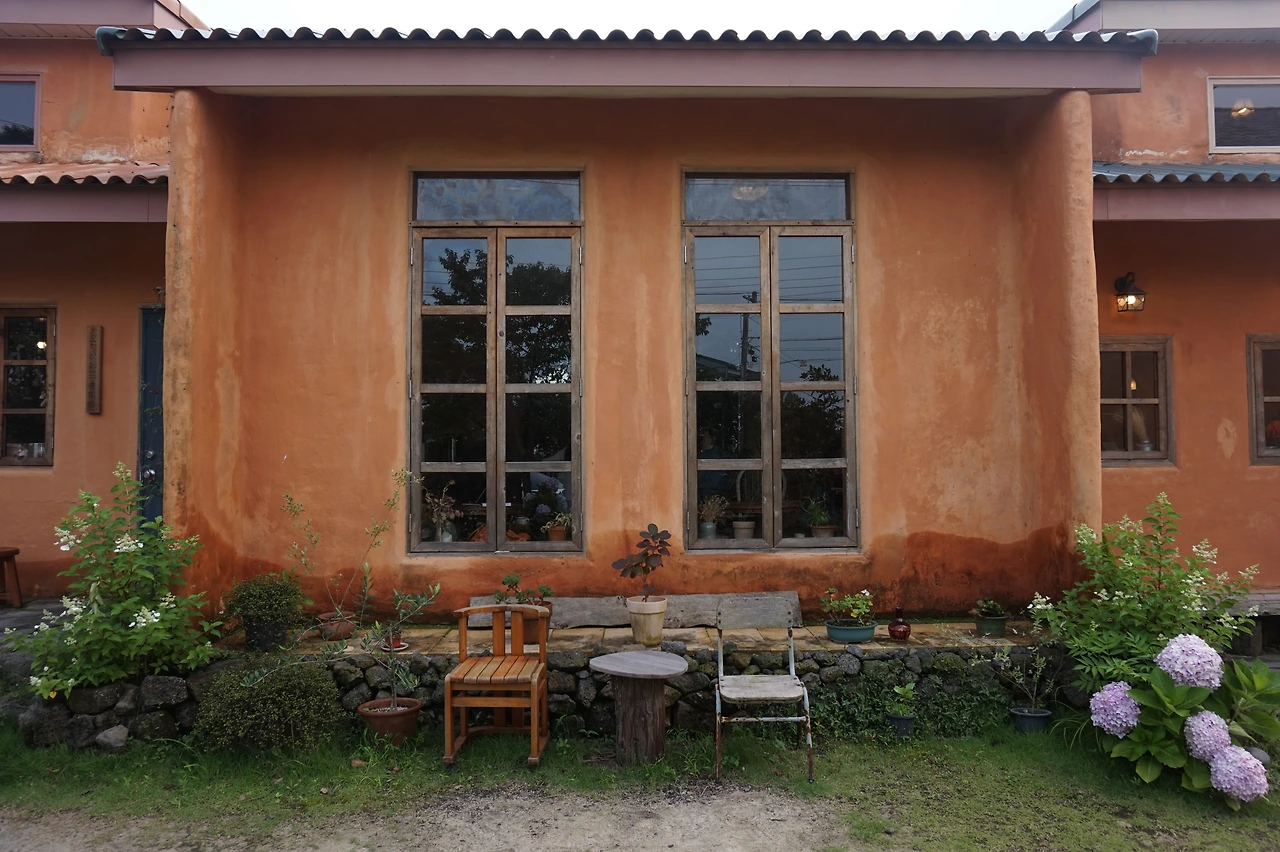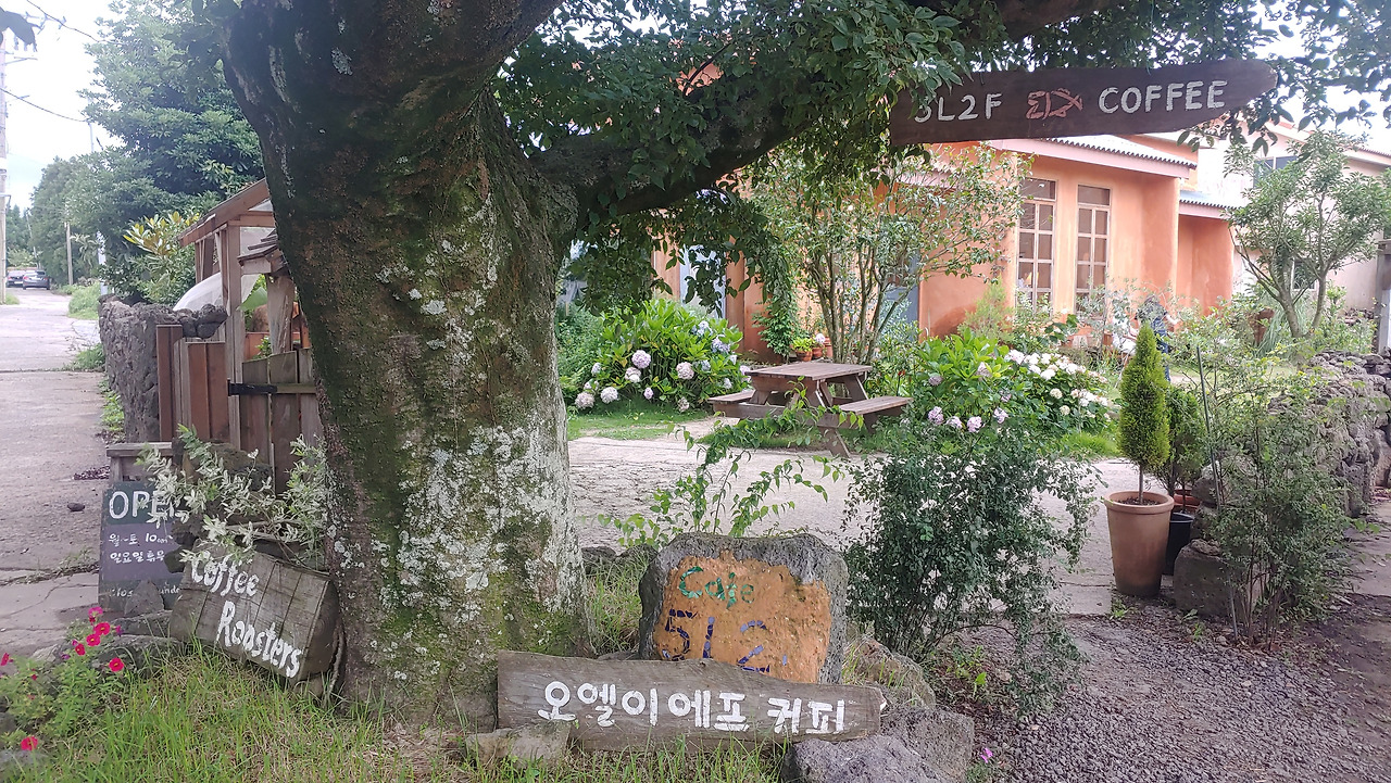 붉은오름 근처의 한라산 둘레길을 오전에 걸었던 어느 날, 지친 몸을 쉬어가고자 주변의 카페를 검색했다. 무슨 연예인이 다녀갔다던, 리뷰가 많던 카페는 직접 가보니 인테리어가 요란하고 영 마음이 가지 않아 다시 검색을 하여 찾아간 곳이 바로 이곳이었다. 황토색 흙집의 외관과 큰 나무에 걸어둔 ‘5 Loaves 2 Fishes’라고 쓰인 팻말부터 뭔가 예사롭지 않았다. 앞서 소개한 카페들처럼 규모가 큰 카페는 아니었지만 이곳은 ‘플랜테리어(planterior)’라는 말에 가장 걸맞은 공간이었다. 나뭇잎이 가득한 한쪽 면에 큰 창을 내고 내부에도 큰 화분들을 가득 두어, 지금 여기가 실외인지 실내인지 헷갈릴 정도로 숲 속에 있는 느낌을 주었다. 말린 꽃들과 작은 화분들, 수도원을 연상시키는 소품들과 조명까지 어느 구석 하나 신경을 쓰지 않은 곳이 없었다. 수국과 이름 모를 꽃들로 아기자기하게 꾸며져 있는 마당도 인상적이었다. 그런데 이곳의 가장 으뜸은 바로 커피 맛! 거품을 가득 올린 ‘뜬구름 커피’(시나몬 카푸치노)는 정말이지 잊을 수 없는 맛이었다. (남편과 나는 집에 돌아와서도 이 커피 맛을 계속 그리워하는 중이다.) 모든 재료는 유기농 재료를 사용한다고 쓰인 안내문에서 주인의 뚝심 같은 것이 느껴졌다. 좋은 취향과 정성이 고스란히 전해지는 공간이었다.