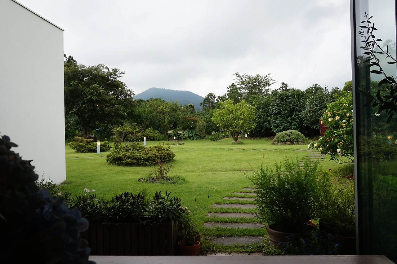 정해진 시간에 조식을 먹으러 다이닝 공간에 가자, 탐스럽게 핀 푸른색의 수국들과 은은한 향을 내는 치자꽃 한 송이가 테이블 위에서 우리를 맞이한다. 조용한 클래식 음악이 깔리고 주인분이 커피와 프렌치토스트를 내오신다. 눈앞에는 초록색 잔디와 오름(알밤오름)이 펼쳐져있다.