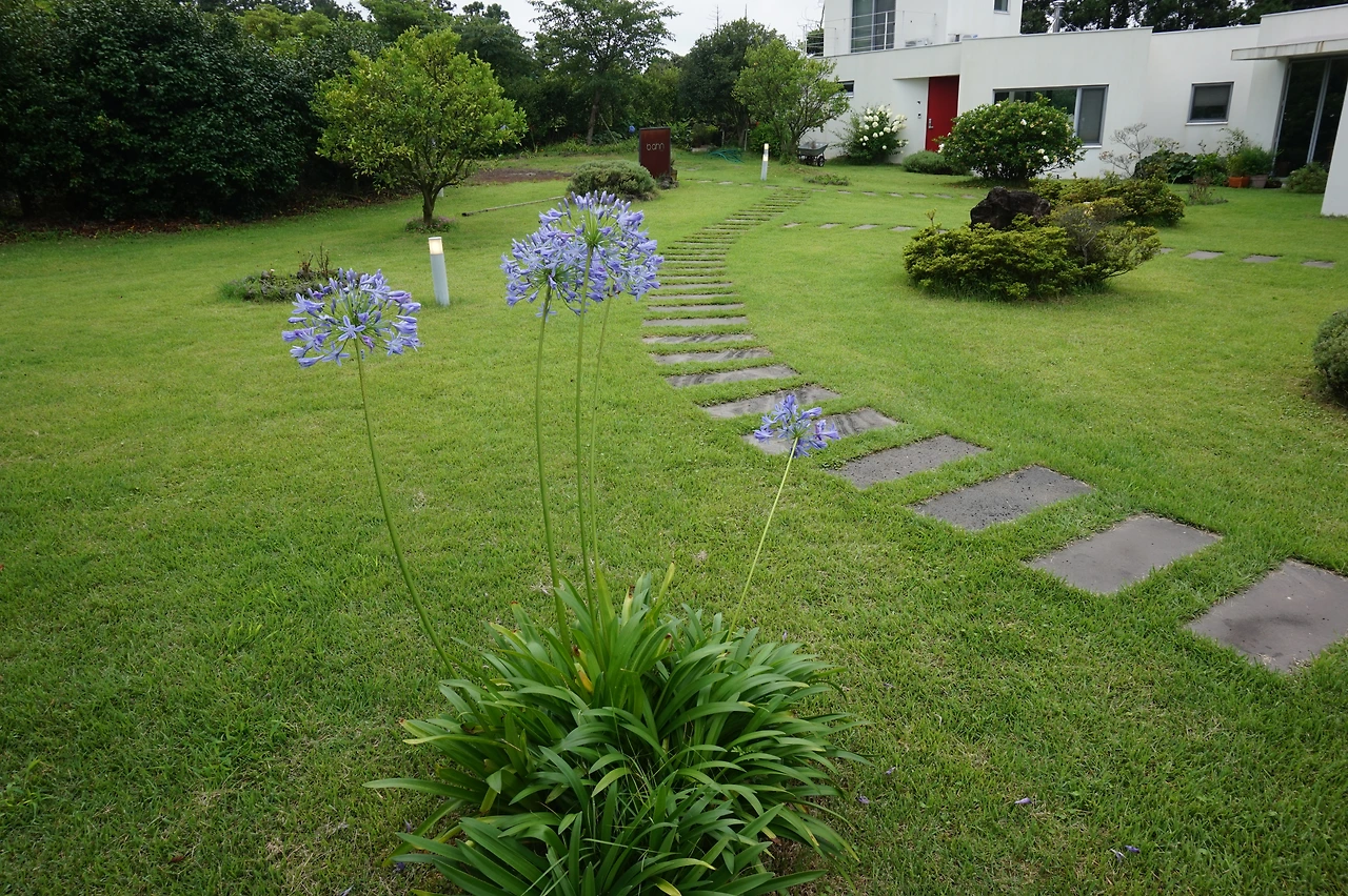 첫 번째는 제주시 조천읍에 있던 <비안>이라는 펜션이다. 이곳은 이번 여행의 마지막 숙소이기도 했다. 넓은 잔디밭에 서 있는 하얀색 건물들과 그 주변을 둘러싼 삼나무들, 그리고 귤밭의 풍경이 근사하다. 여기엔 주인 부부가 거주하는 공간과 다이닝 공간, 그리고 2인 숙박을 위한 공간들이 나뉘어있다. 깔끔하게 정리되어 있는 마당에는 수국과 치자꽃, 연보라색의 아가판투스가 피어있었다.