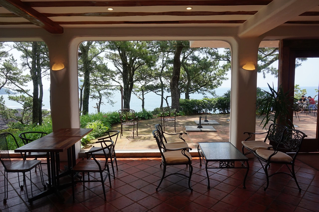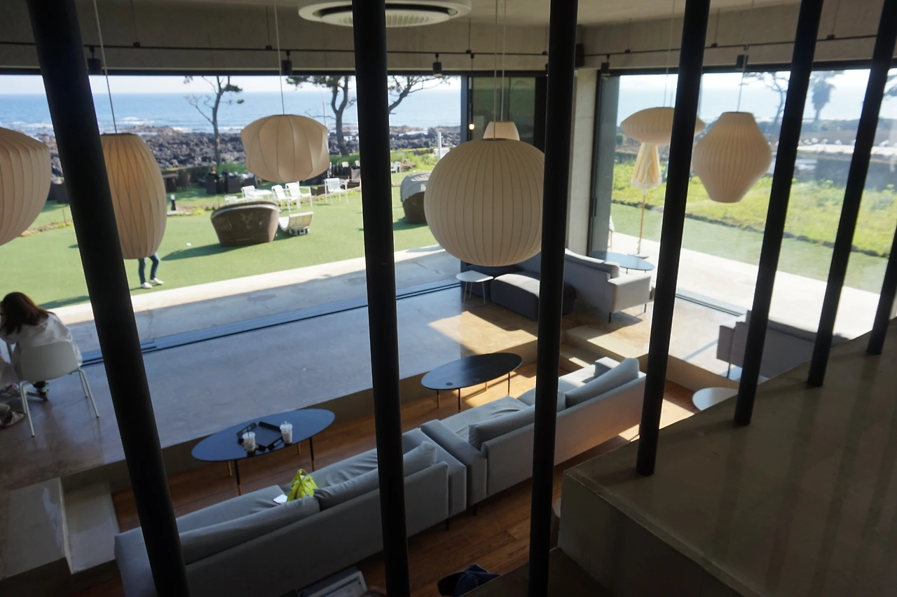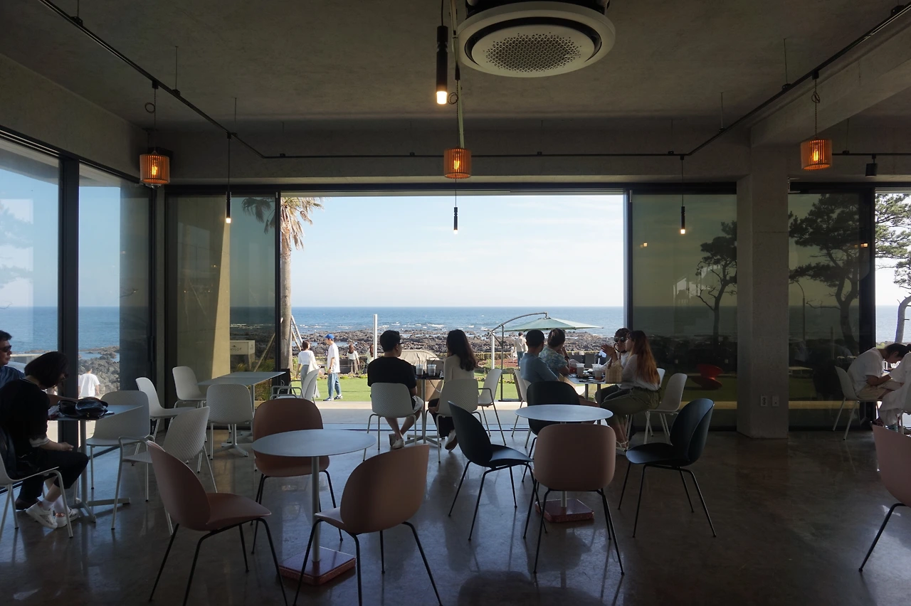 높은 층고와 감각적인 인테리어. 공간 자체가 널찍하고 개방감이 뛰어나며 워낙 위치가 좋다. 서귀포의 바다가 바로 앞에 펼쳐져 있고 카페의 오른쪽엔 박수기정과 산방산이 보이니 말이다. 그렇지만 이곳을 특별하게 만드는 건 그것만은 아니다. 주인공은 자신이 아니라 아름다운 자연 풍광이라는 걸 너무나 잘 아는 건축이라고 해야 할까?