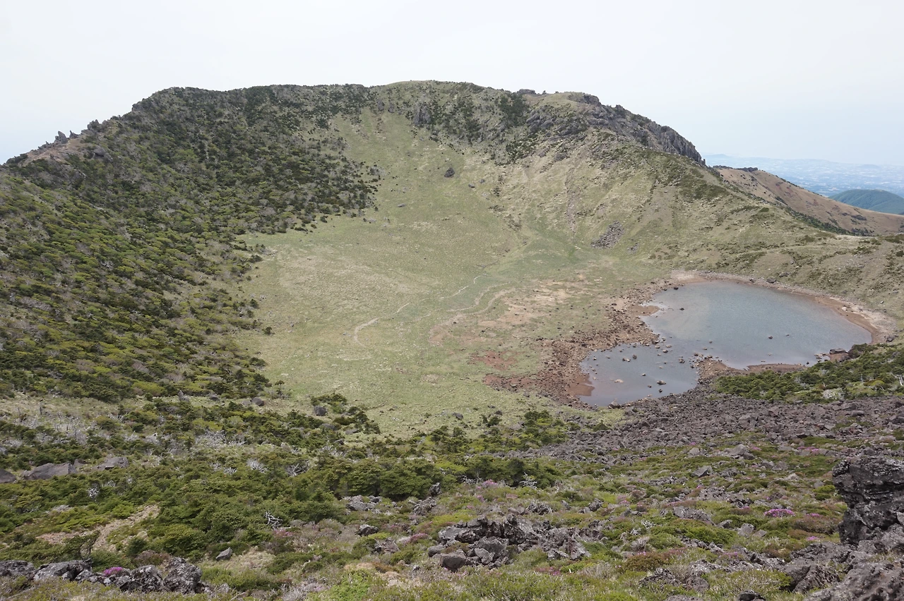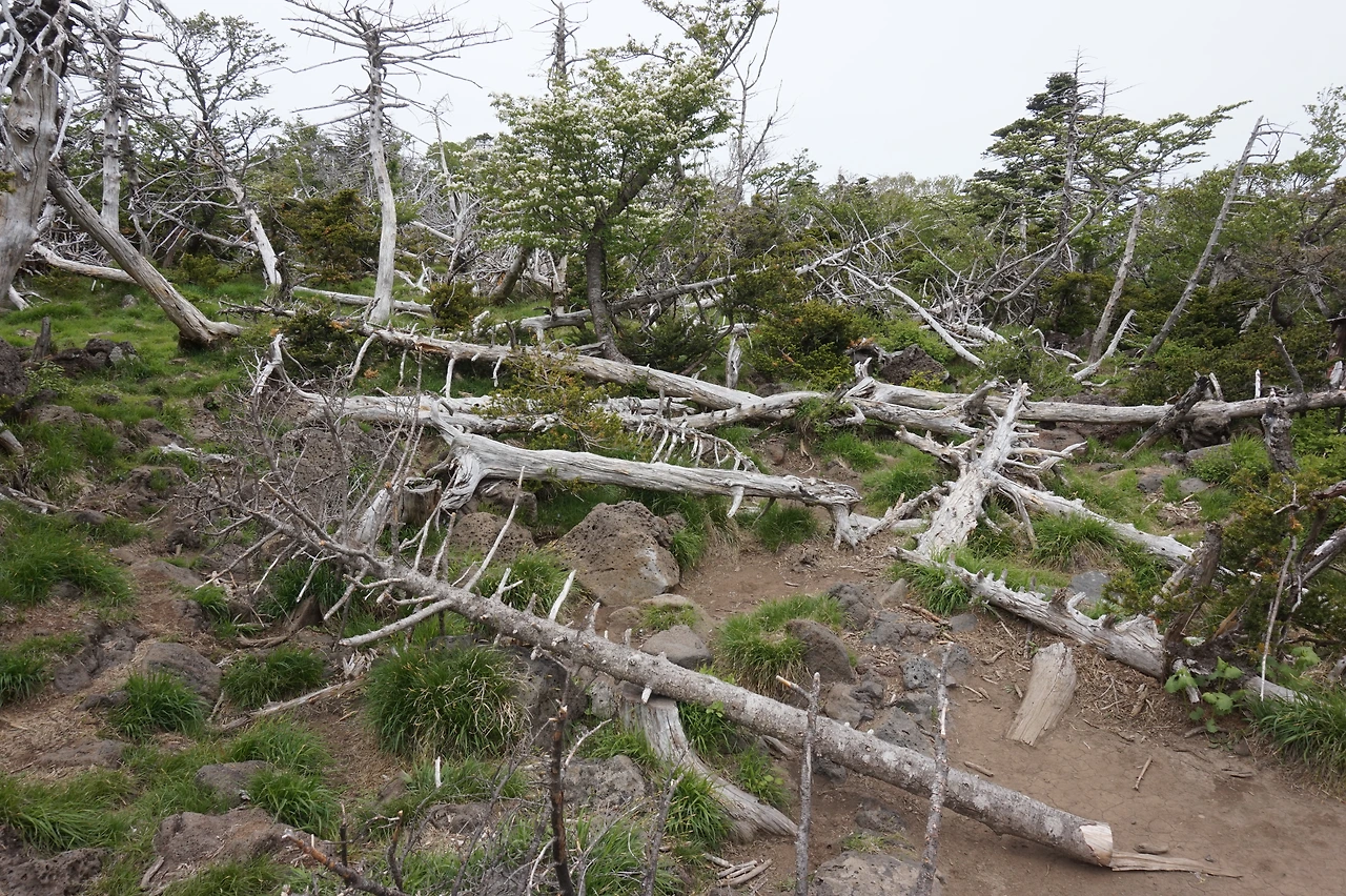 그래도 가까스로 진달래 대피소를 오후 1시 전에 통과했다. 소기의 목적을 달성한 것이다. 여기에서부터 백록담까지의 구간 중 마지막 부분은 그래도 오길 잘했다는 생각이 들게 만드는 근사한 풍광을 보여주었다. 바람이 엄청나게 불고 한기가 느껴질 정도로 기온이 떨어졌다. 사방이 확 트여있어 제주 전체의 풍경이 내려다보였고, 수없이 많은 오름들이 눈앞에 펼쳐져있는 모습이 조금은 비현실적으로까지 느껴졌다. 어디에서도 본 적 없는 풍경이었다. 여기저기에, 일부는 쓰러져 있는 상태로 보이던 고목들은 황량하면서도 이국적인 분위기를 만들어냈다. 온몸으로 바람을 맞으며 드디어, 마침내 정상에 올랐다. 기쁨보다는 기진맥진과 안도감에 가까운 심정이었다. 진이 다 빠져서 잘 웃어지지도 않는 얼굴로 겨우 기념사진을 한 장 박고는 정상에 앉아 잠시 쉬었다. 백록담에는 생각보다 물이 적어 기대했던 모습과는 조금 달랐고 왠지 아쉬웠다. 정상에 다 와서도 시간의 여유가 별로 없었는데, 2시 반까지는 모든 사람이 다 내려가야만 했기 때문이다. 사람들이 다 떠날 때까지 계속 안내방송이 나왔고, 결국 우리가 마지막 주자가 되어 하산을 시작했다.