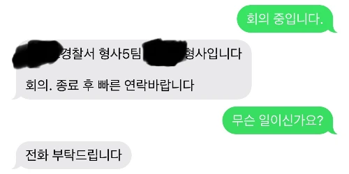 3주가 지났다. 쏟아지는 미팅과 업무를 쳐내며 정신없는 하루를 보내고 있었다. 미팅 중 모르는 번호로 전화가 왔다. 수신 거절 메시지를 보냈다. 문자 회신이 왔다. 'XX 경찰서 형사 5팀 ooo형사입니다. 회의 종료 후 빠른 연락 바랍니다'