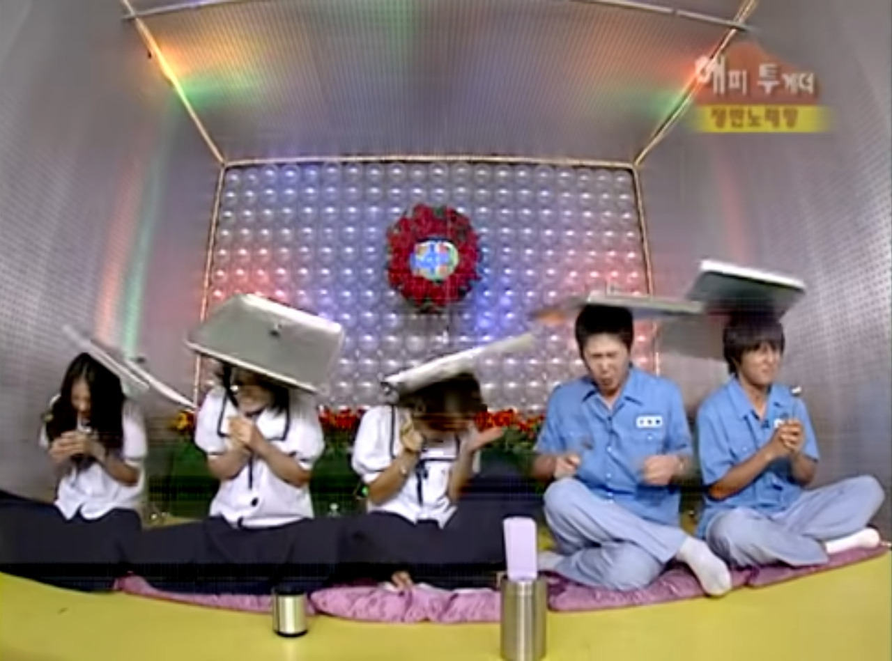 2000년대 KBS 인기 예능 프로그램 '해피투게더 쟁반노래방'. 노래를 부르다가 가사를 틀리면 저렇게 머리 위로 쟁반이 꽝 떨어짐!