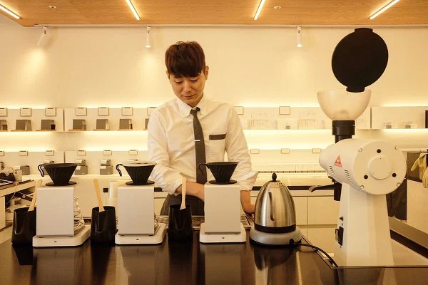 매장은 마치 실험실을 방불케 합니다. 이날은 방준배 바리스타만 있었는데, 평소에는 로스팅실에 하얀색 연구용 가운을 입은 로스터도 있고 또 매장에는 정장을 입은 바리스타들이 보입니다.