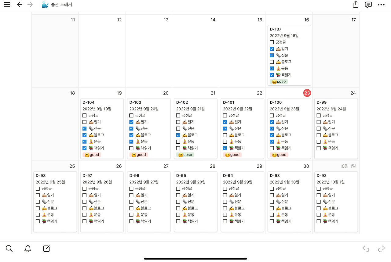 오늘이 지나가기 전에 이 글을 쓰고, 트래커를 만든 것이 참 좋다. 100일 동안의 긍정의 말들이 2023년의 나를 어떻게 변화시킬지가 기대된다.