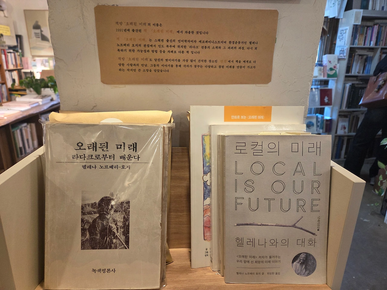 든든하게 몸과 마음을 채우고 '오래된 미래'로 다시 돌아갔다. 이런 곳에 있는 독립서점이 어떤지 꼭 보고 싶었기 때문이다. 겉에선 초라해 보이기도 했는데 실내는 다정함이 몽글몽글 솟는 듯 아기자기했다. 생각보다 공간이 넓었고 책도 은근히 많았다. 곳곳에 오래전 책과 지금의 책이 함께 전시되어 있는 점이 무척 특이했다. 과거와 현재가 공존한다는 게 이런 걸까.