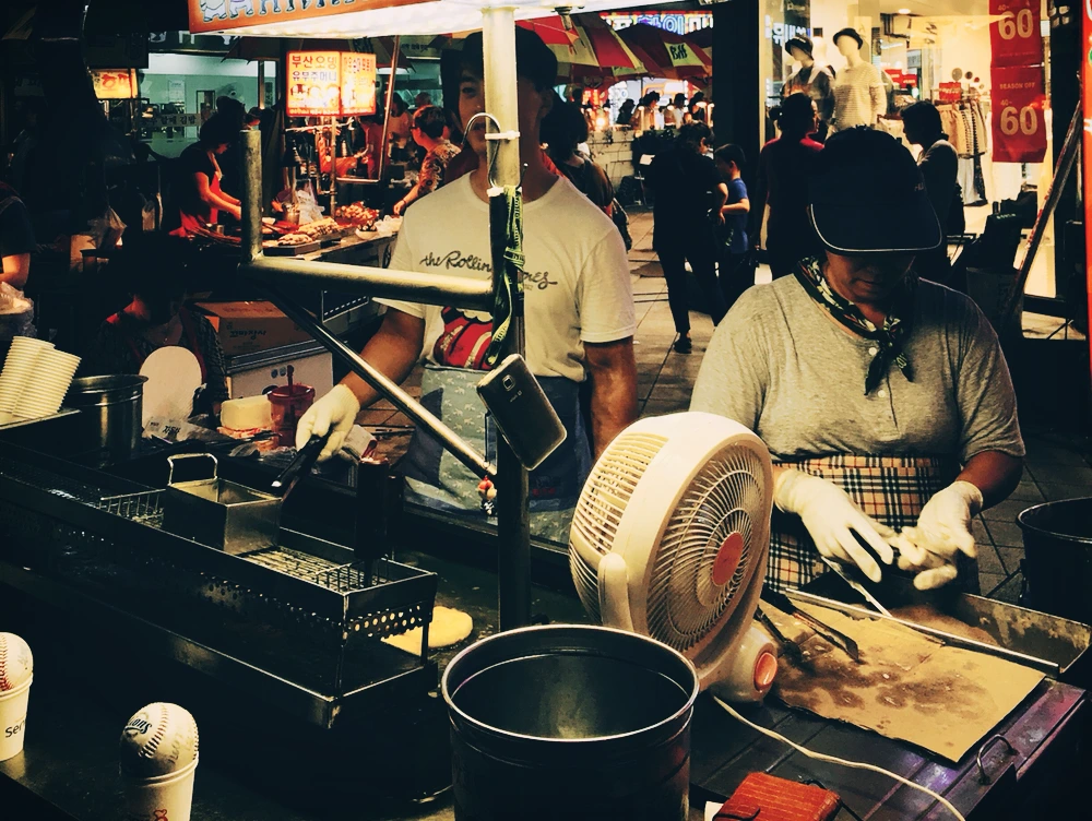 여행 첫 날의 첫 끼를 드디어 먹는 순간이었다. 사실 혼자서 밥 먹는 것은 익숙하지 않지만 그래도 평소에는 배가 고플 땐 혼자서라도 식당을 찾아서 간다. 국밥을 먹고 국제 시장을 한바퀴 둘러보았다. 블로그에서나 봤던 유명한 씨앗 호떡을 길에서 팔고 있어 하나 사먹으려 기나 긴 줄에 자리를 잡고 섰다. 여러 가지 견과류가 가득 들어있는 씨앗 호떡의 가격은 단돈 천 원. 서울에서는 보기 힘든 가격 대비 정말 맛 좋은 호떡이었다. 그 밖에도 닭꼬치, 만두, 떡볶이, 튀김 등등 여러 길거리 음식이 많았다. 다 먹고 싶었지만 이기대에 가고 싶어서 시간을 체크해 보았다. 원래 부산은 야경이 예쁘다고 들어서 이기대에서 멋진 광안대교의 모습을 보고 싶었다. 하지만 버스 시간을 보려 휴대전화를 본 순간 이미 밤 10시. 서울은 밤 10시가 되어도 길이 훤하고 밝아서 집에 가야겠다는 생각을 잠시 접어둘 때가 많았는데, 부산은 아니었다. 모두가 문을 닫고 집에 가야하는 분위기였다.