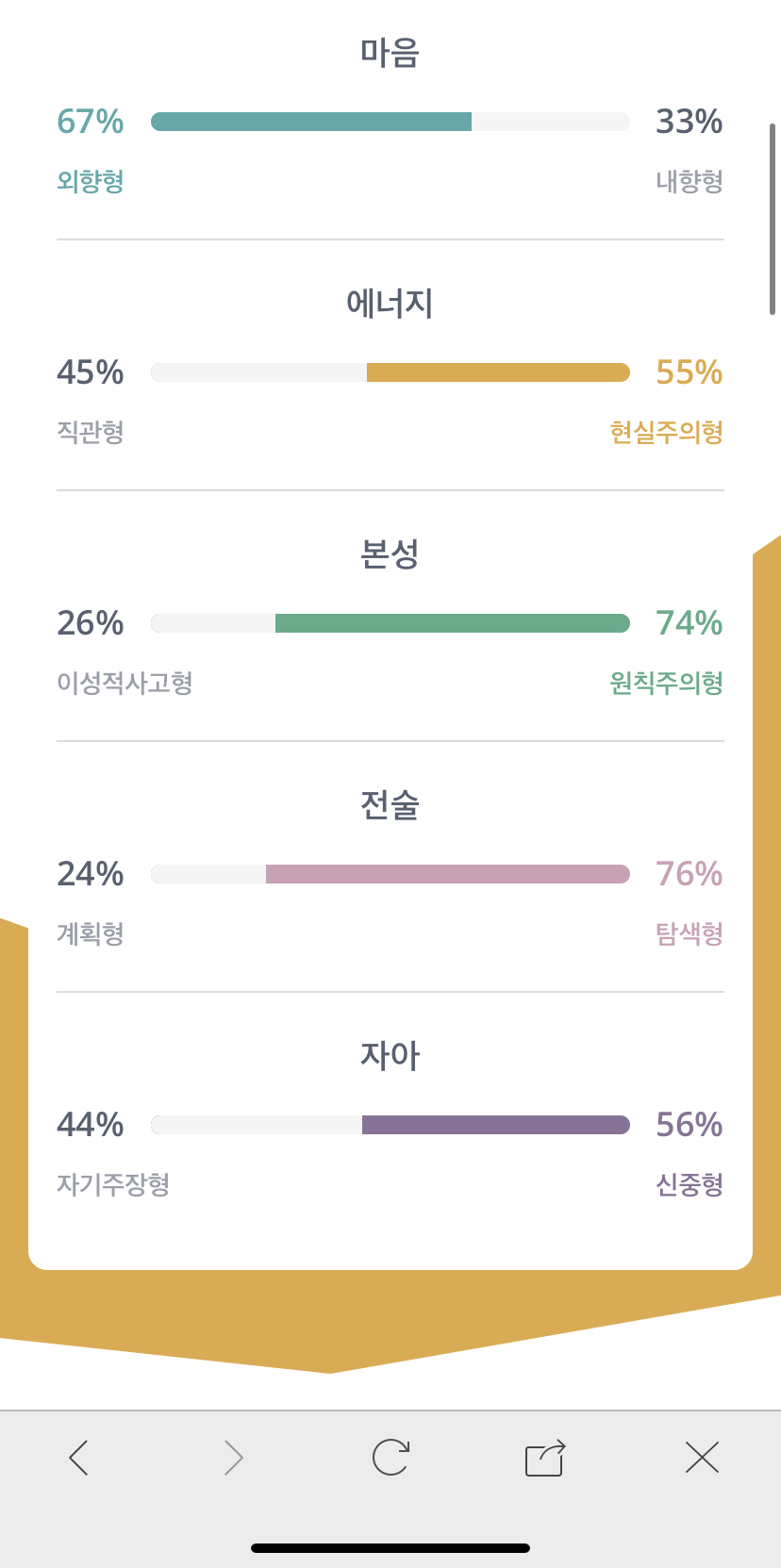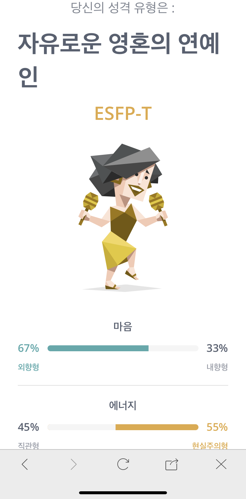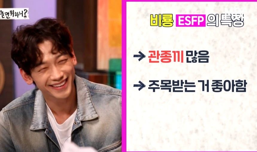 요즘 유행하는 MBTI를 인터넷으로 다시 해봤다. 회사에서는 한 권 분량으로 했던 것 같은데 인터넷에 있는 문항은 꽤 단순하다. 그래서일까? 내가 기억하는 성격과 영 다른 유형이 나왔다. ‘자유로운 영혼의 연예인’이라니... ‘놀면 뭐하니’에서 비가 해당된다고 나온 그 유형이 왜 나에게 나오지......