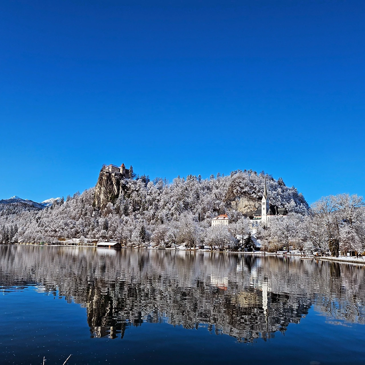 높은 산에 쌓여있는 눈은 스위스의 만년설을 가져다 놓은듯했고, 호수에 비치는 블레드성은 이 세계가 아닌듯한 착시현상까지 보이는 듯했다.
