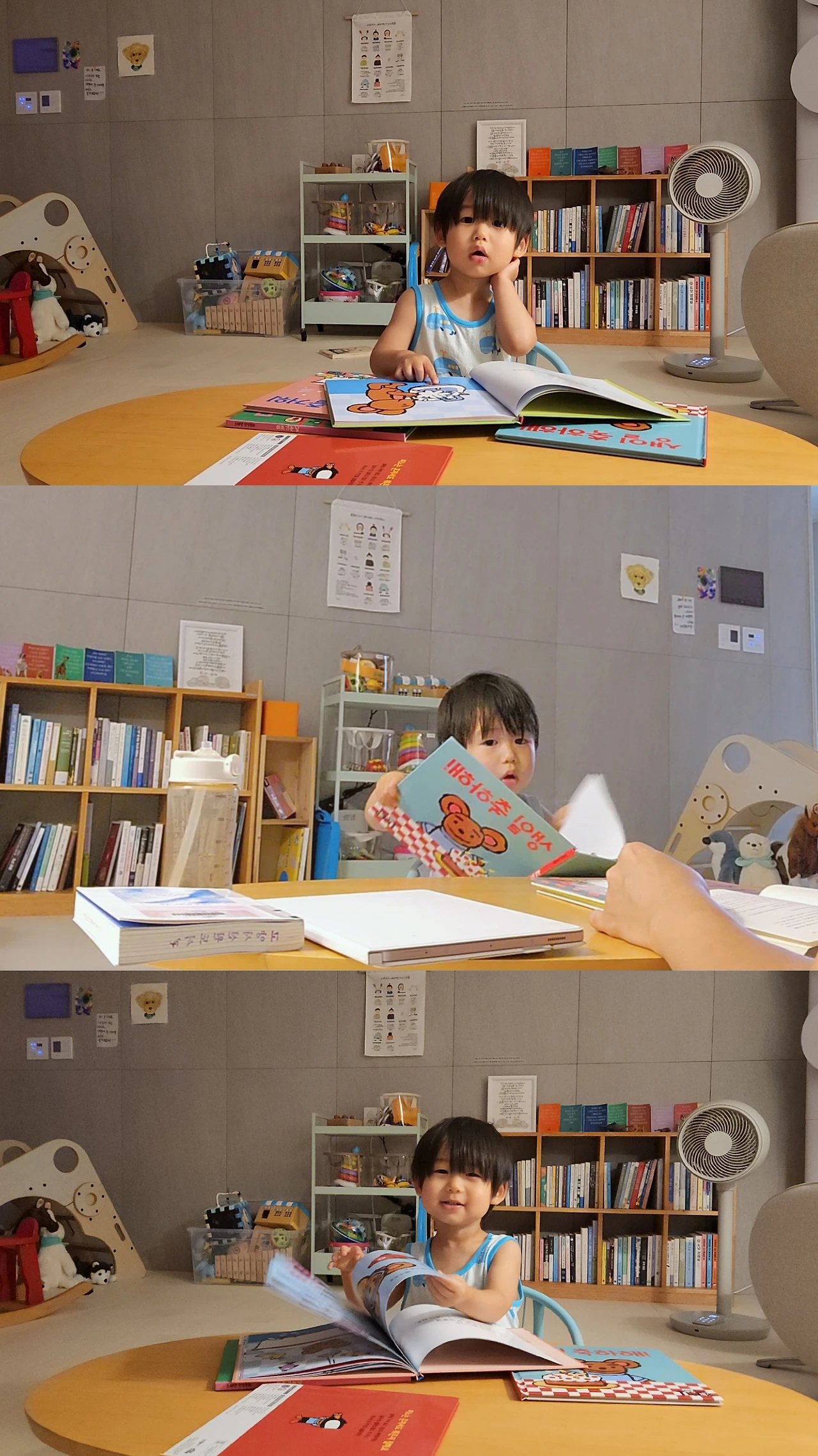 지금의 선이는 자유 놀이 시간이 시작되면 처음엔 책을 꺼내 보거나, 주방 서랍을 열어보거나, 장난감을 만지작거리며 제법 잘 논다. 하지만 5분만 지나면 “물 주세요”, “수건 주세요” 하던가 우산 꼭지를 입에 물며 나타나 내가 가만히 앉아 있을 수 없게 만든다. 단호하게 “아직 자유 놀이 시간 20분 남았어. 그다음에 아빠랑 놀자” 하면, “자유 놀이 시간 끝나면 같이 놀자”하며 거실로 돌아가 다시 잠깐 혼자 놀기를 시도한다. 아직은 이런 식의 반복이라, 온전히 자유 놀이 시간이라 볼 순 없지만, 앞으로 조금씩이라도 함께 있지만 따로 보내는 시간을 점점 늘려가 보려고 한다.