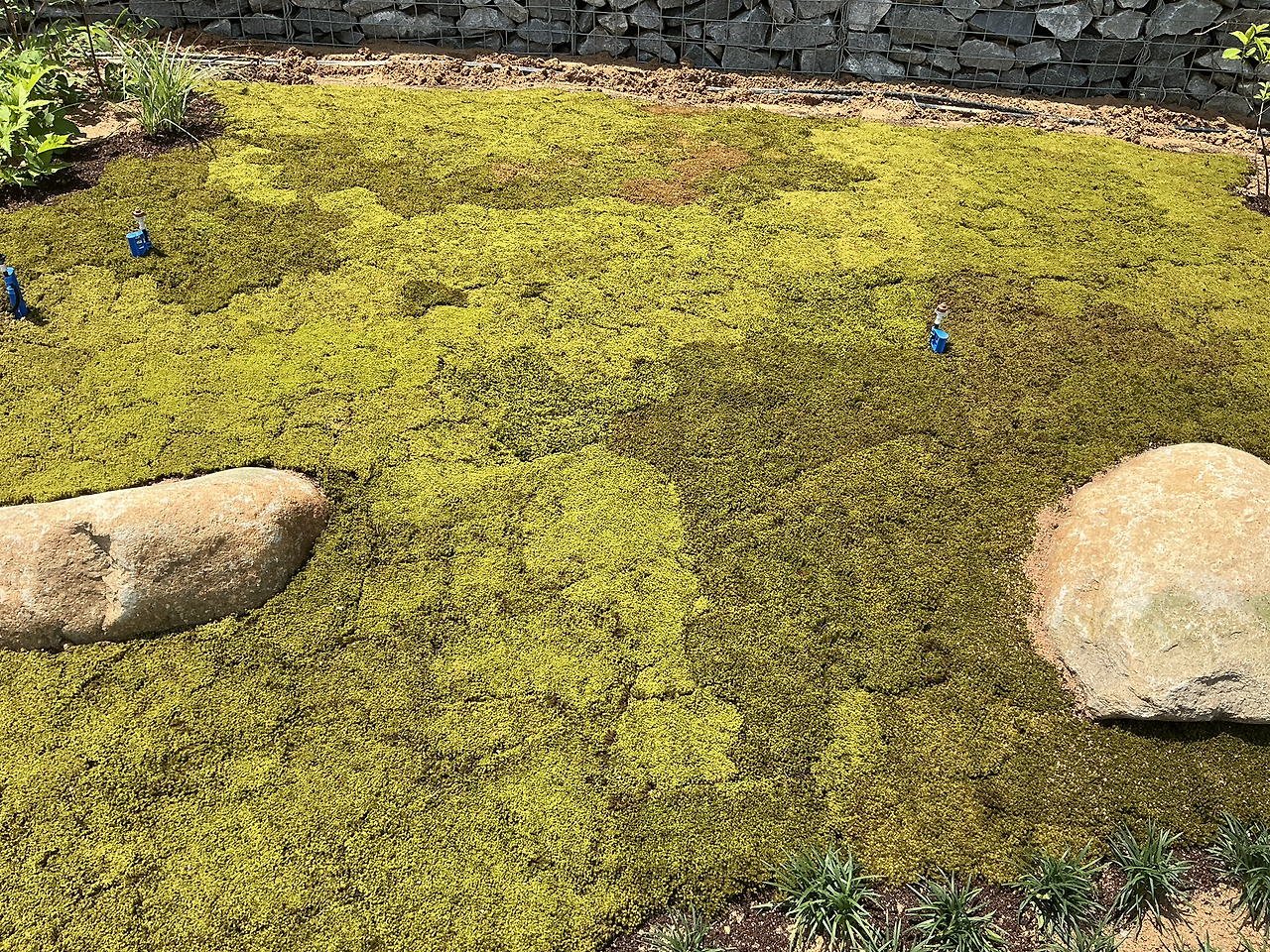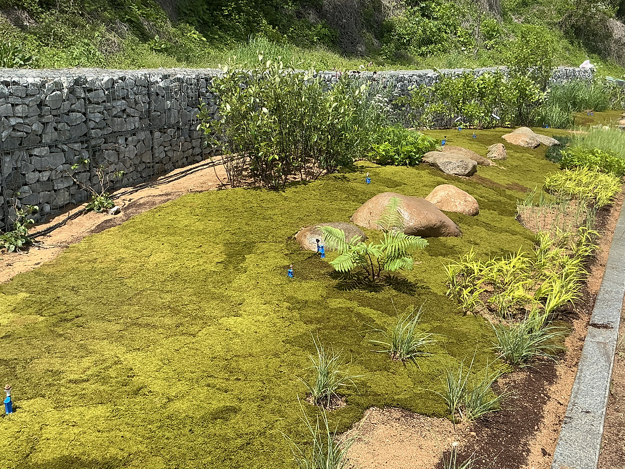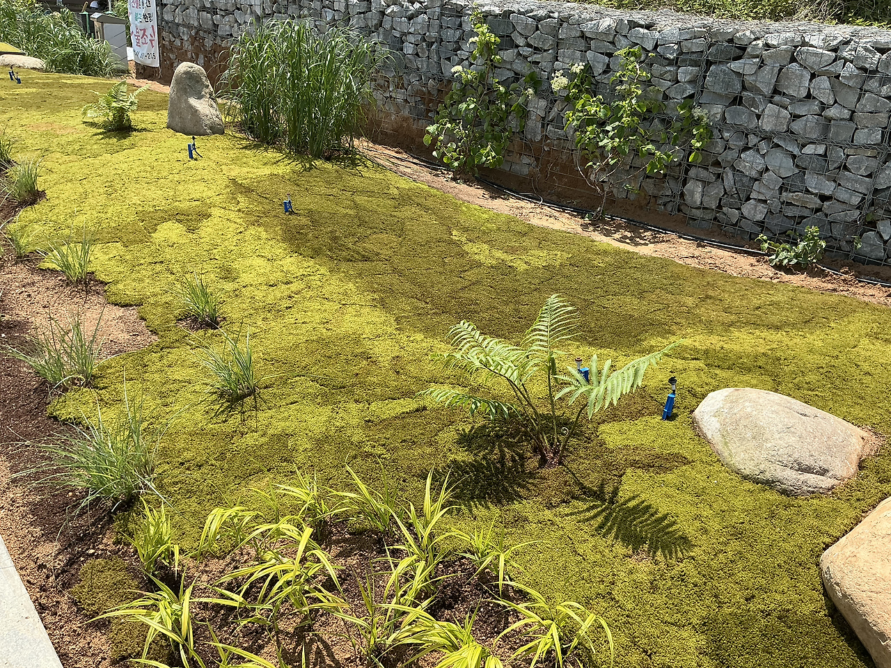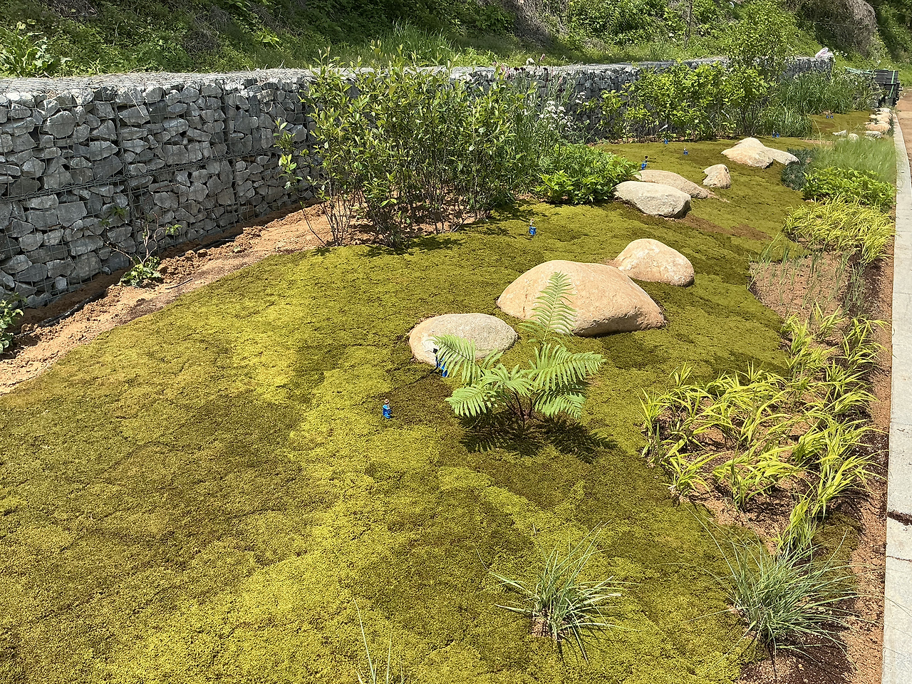 소교목과 풀 꽃 무리에 탄소이끼로 작은 언덕감을 준 탄소 제로 정원을 만들고 있습니다 .