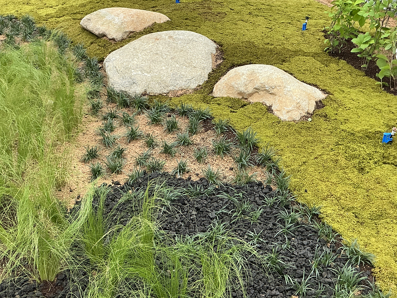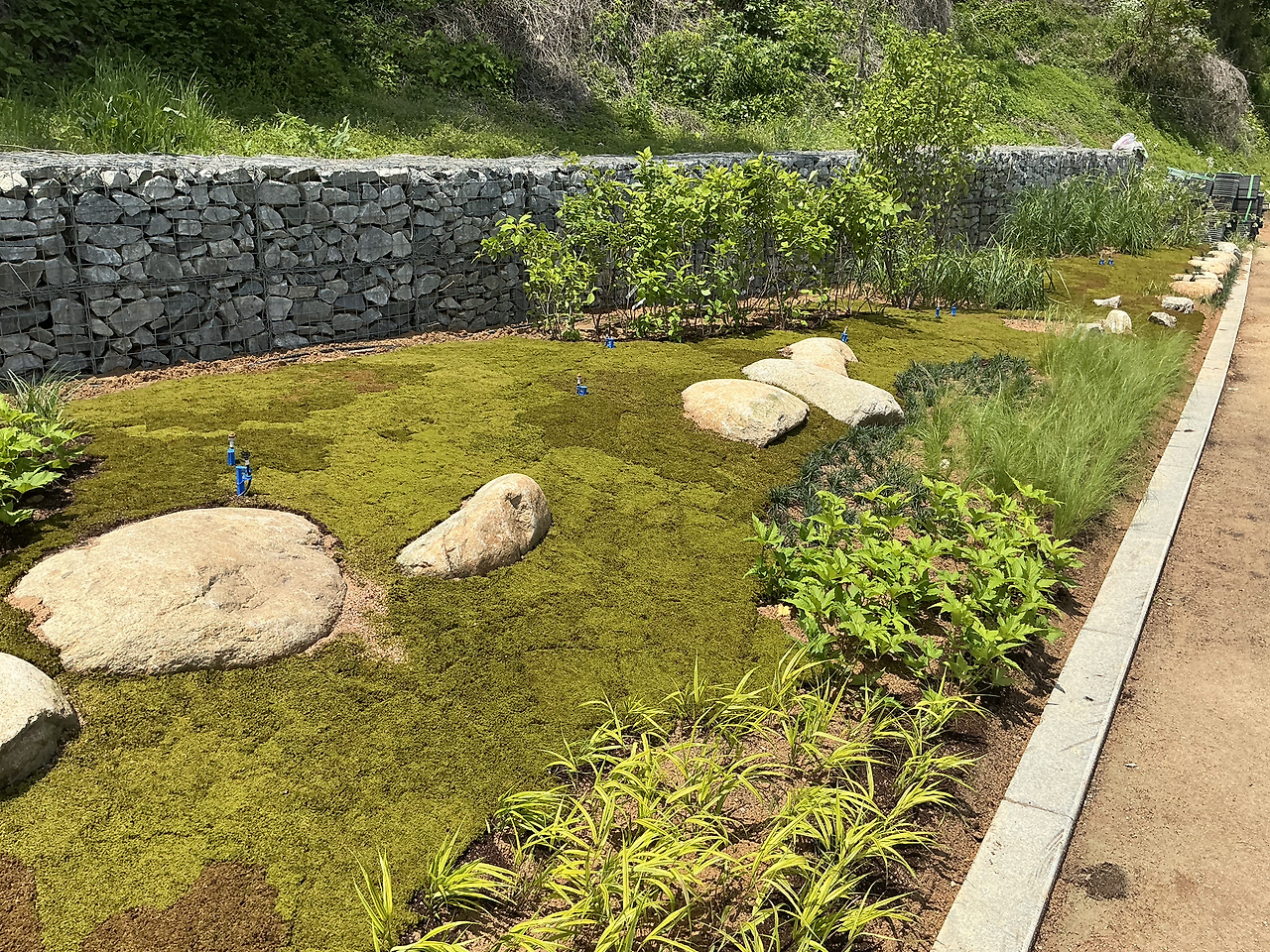마지막 마무리 흙으로 그대로 두고 일정한 잡초를 유입하여 혼재 시키고 싶었으나, 공공 정원이라 깔 끔 마무리 한다고 현무암 분쇄 돌로 마무리해요 .