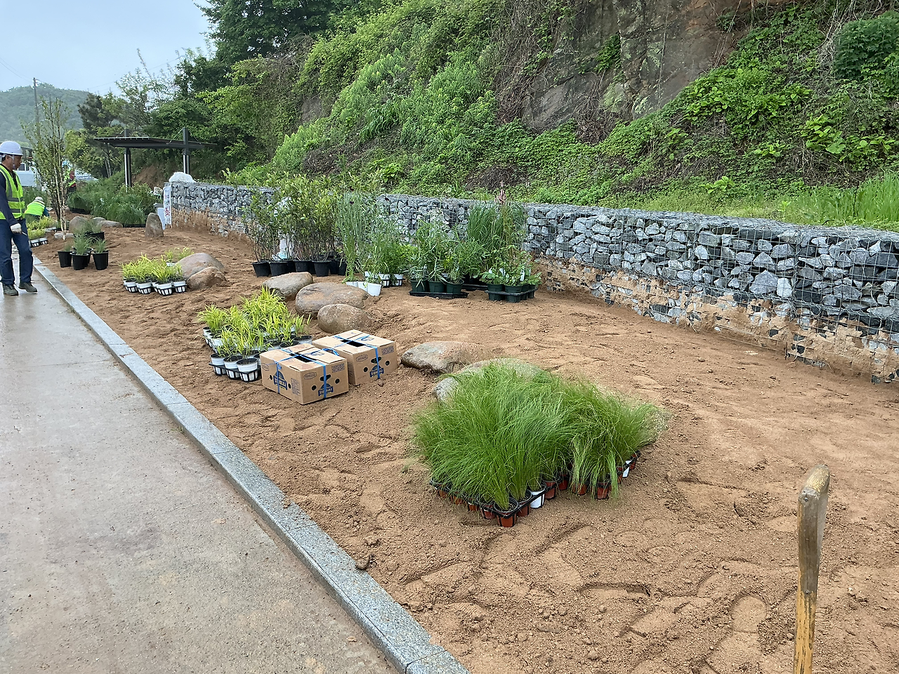 식물 종류들은 해안 바람에 강하고, 적당한 바다 소금기를 잘 이겨내는 야생화, 사초, 윤노리 가침박달,실새풀, 중키억새, 타래붓꽃 등이지만. 주변 산자락에. 고사리 야생미나리 나리 꽃등이 흐드러지게 분포되어 함께 배치 했습니다.