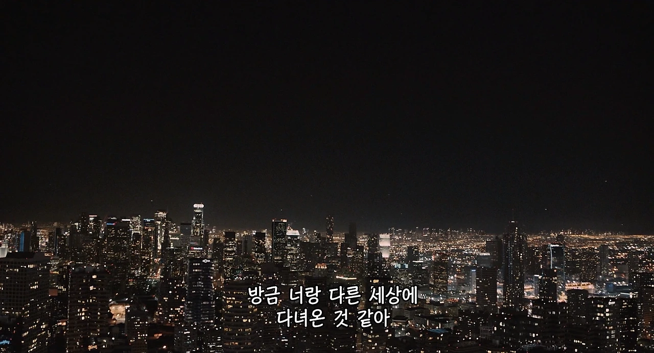 다른 세상은 도시 위의 광활한 우주다. 뒤집힌 세상에서. 밤하늘에서 쳐다본 잿빛 건물들은 이제 반짝이는 별과 같다. 건물 사이의 도로와 불 켜진 가로등은 은하수다. 각진 도시에서 그는 구원받는다.