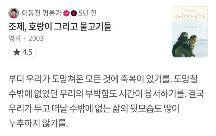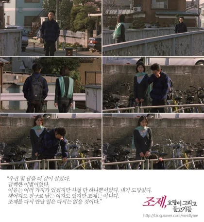 그렇다면 <한달 후, 일년 후>의 조제처럼 허영과 탐욕을 느끼지 못할 정도로 재물이 넉넉한 상태는 이 딜레마를 해소해 줄까? 오히려 자신이 무익한 존재라는 사실에 권태로움을 느끼며, 역설적이게도, 자신의 권태로움을 해소해 줄 누군가의 역동성에게 귀의하고자 할 것이다. <조제 호랑이와 물고기> 속 전동 휠체어를 사자는 츠네오의 제의에 반문하는 조제처럼 말이다.