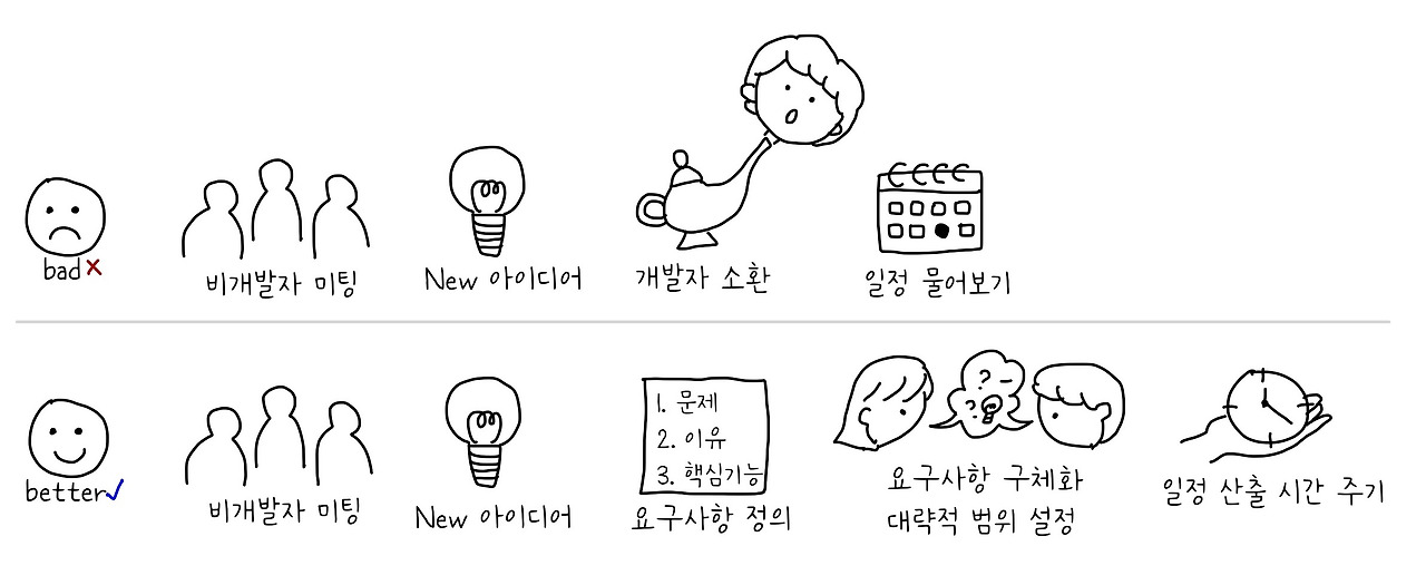 지금까지 이야기는 제가 대기업과 스타트업에서 프로젝트 관리자, 서비스 기획자로 일하며 경험해 왔던 점들을 토대로 정리한 것입니다. 물론 프로젝트 특성이나 팀 문화에 따라 다양한 변수가 존재하기 때문에, 여기서 제안한 방식이 100% 정답은 아닐 수 있습니다. 다만, 아이디어를 글로 구체화한 다음, 일정 산정을 위한 검토 기간을 확보하는 것만으로도 많은 문제가 사전에 방지되고 개발자와 소통이 수월해지는 것을 여러 차례 경험했습니다.