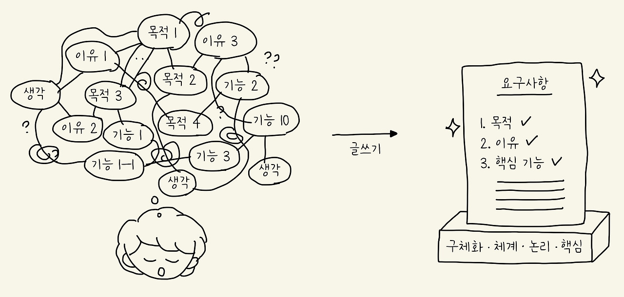 결국, 아이디어를 글로 구체화하는 것은 단순히 “머릿속에 있는 생각을 정리하는 행위” 이상이라고 생각합니다. 팀 전체가 프로젝트의 목적과 방향을 공유하고, 효율적이며 체계적으로 작업을 진행할 수 있도록 해주는 중요한 단계라고 할 수 있습니다.