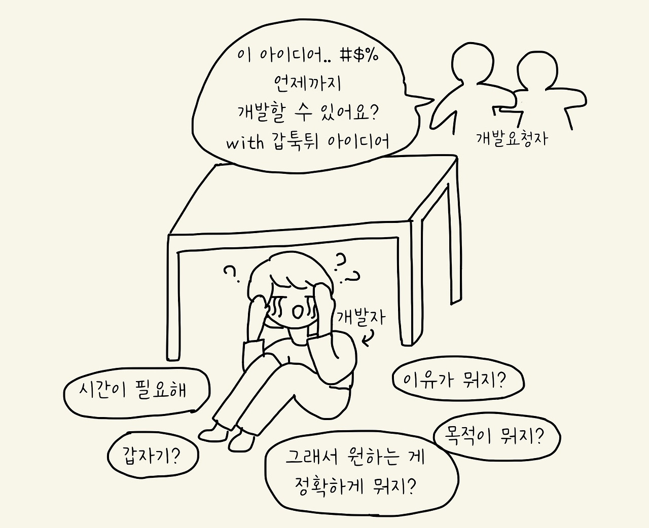 개발자 입장에서는 기능의 범위, 구체적인 요구사항 등을 알아야만 일정을 어느 정도 가늠할 수 있습니다. 이런 정보가 누락된 상태에서 곧장 “언제까지 가능하냐”라고 물으면, 일정 산정이 부정확해지기 쉽고, 실제로 개발을 진행하는 과정에서도 예상치 못한 부분이 계속 드러나 시간을 더 잡아먹거나 기능이 바뀌는 일이 비일비재합니다.