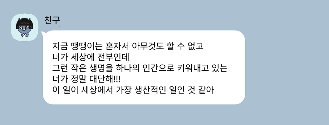그런 나에게 힘이 되어준 친구의 말이 있었다. 친한 친구에게 경력 단절에 대한 불안감과, 매일 반복되는 일상으로 인해 생산적이지 않은 활동만 하는 것 같은 내 모습이 힘들다고 털어놓았았다. 친구는 공감과 위로를 해주며 이렇게 덧붙여 말해주었다.