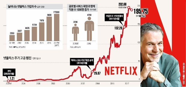 2002년 기업공개 당시 1억5000만달러에 불과했던 넷플릭스 매출은 2007년 12억500만달러, 2016년 88억3000만달러로 불어났습니다.