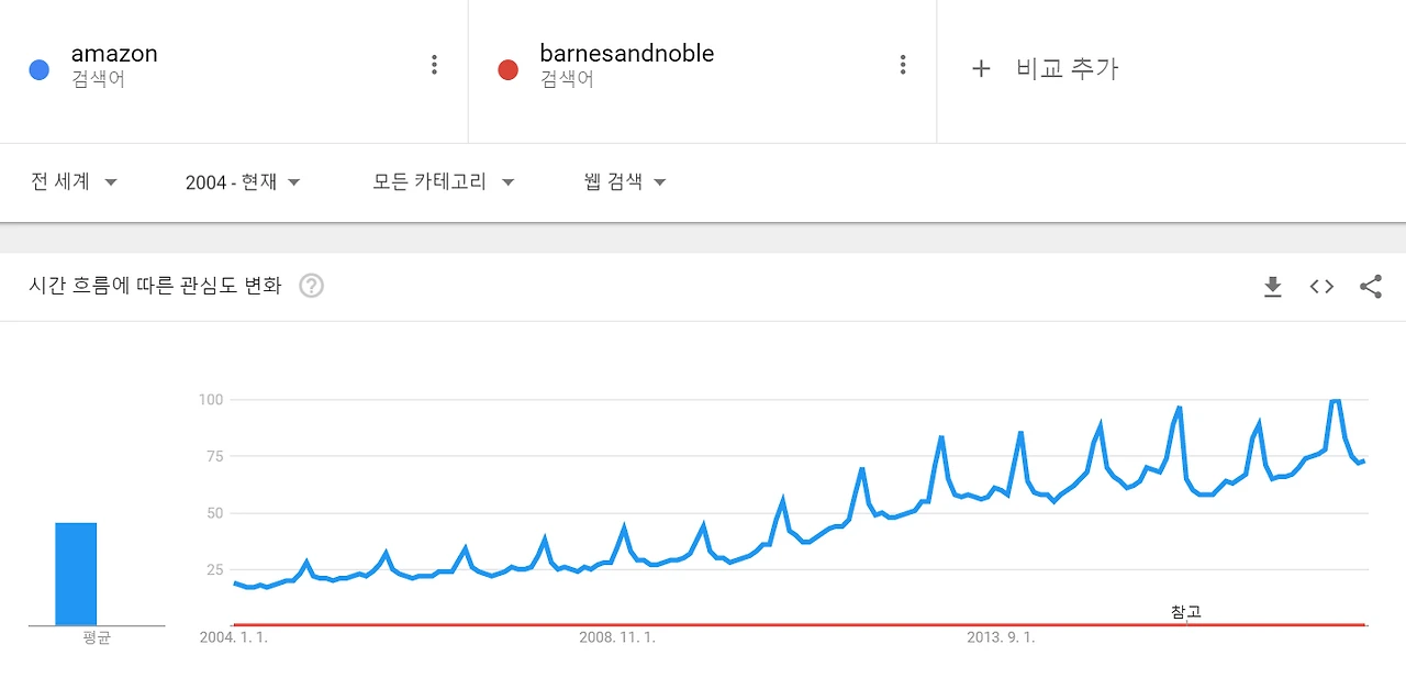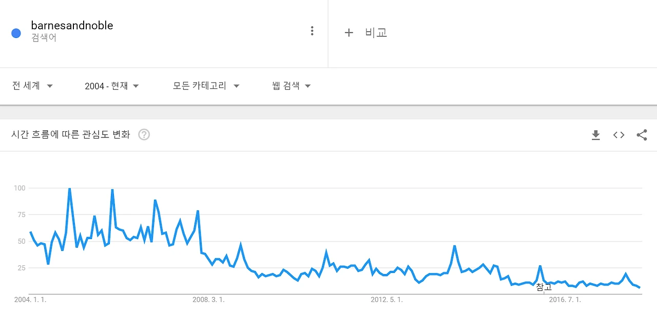 아래 구글트렌드를 통해 두 기업의 검색량을 비교한 그래프를 보면 운명의 변곡점을 확연히 알 수 있습니다 (2004-현재). 바로 아래 그래프를 보면 지금 아마존과 반스앤노블의 격차는 하늘과 땅이라고 해도 과언이 아닙니다. 그런데 아마존에 비해 반스앤노블의 수치가 거의 0라 언제부터 그 격차가 급격하게 벌어졌는지 알기 어려워 따로 반스앤노블만 조회해봤더니 2007년여쯤부터 관심도와 검색량이 급격하게 떨어지는 것을 알 수 있습니다.
