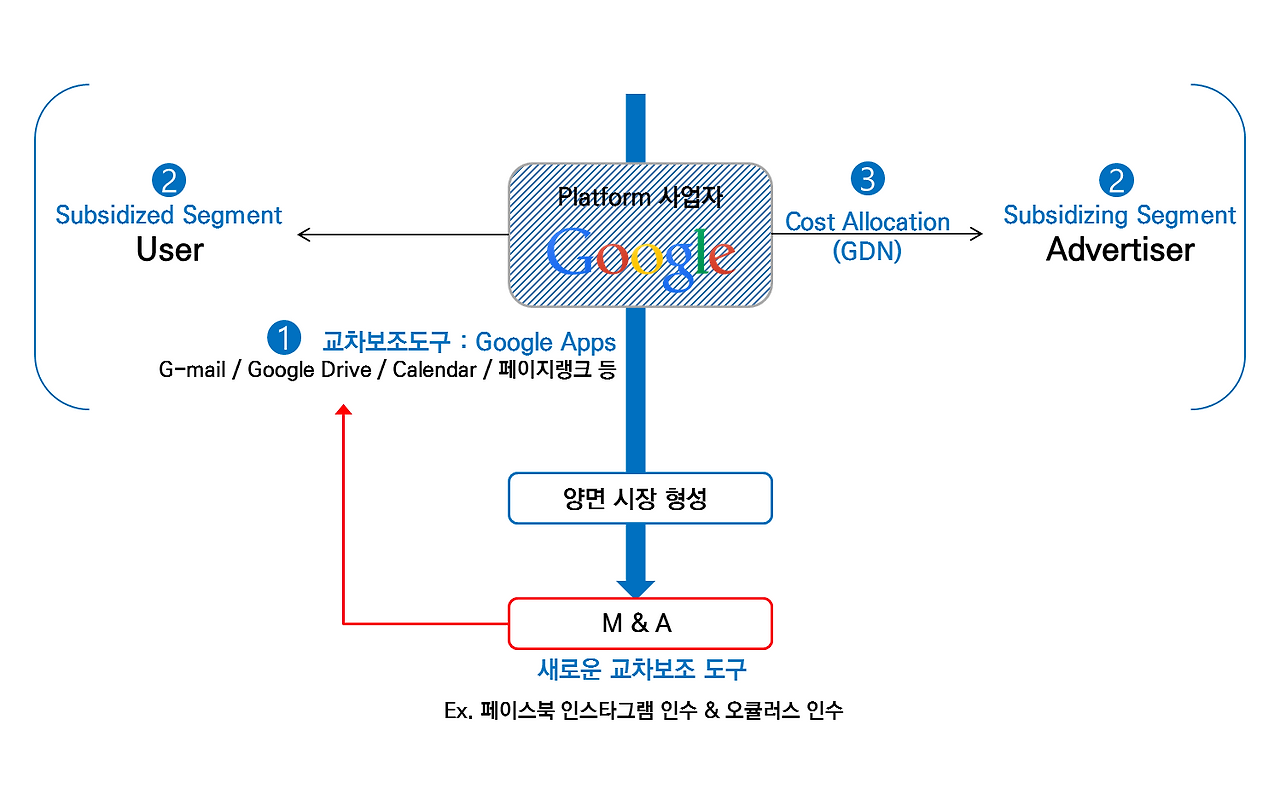 2) 양면시장 : 이로 인해 구글은 많은 유저들을 끌어들일 수 있었고, 유저 집군을 두 가지로 정의할 수 있었습니다. 먼저 subsidized segment로는 구글 이용자인 대중으로 잡을 수 있고, 또 다른 유저집군인 Subsidizing Segment는 광고주로 구성할 수 있게 된 것이죠.