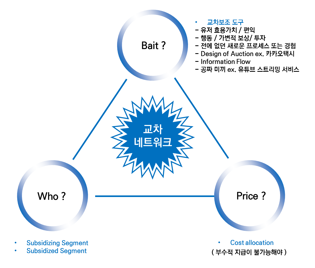 바로 이 세 가지죠. '양면시장은 뭔지 알 것 같은데, 교차보조도구는 뭐고 플랫폼의 가격전략은 또 무엇이란 말인가'. 이런 질문이 워딩을 읽자 마자 떠오르는 생각일 거라 생각해요. 하지만 상기에서도 말씀드렸듯이 워딩의 장난일 뿐 모두 쉽게 이해가능한 수준의 이야기들입니다 :)