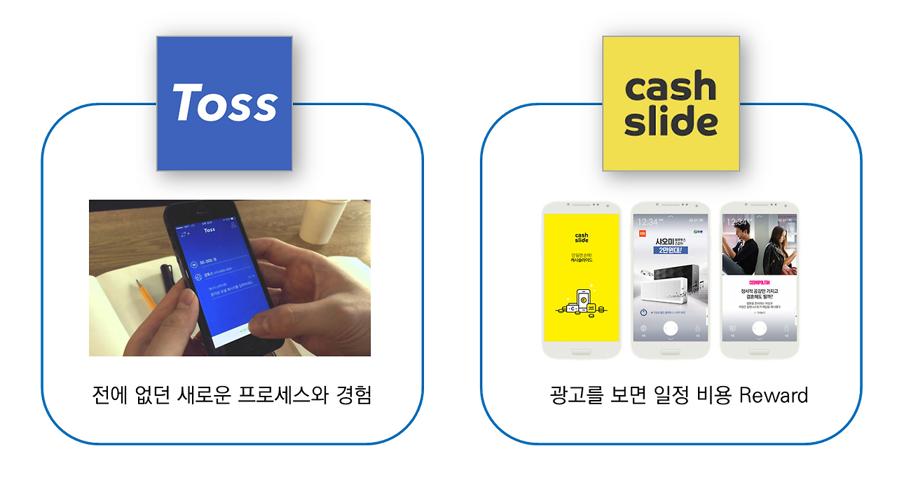 우리 일상에서 자주 사용하는 앱 중에서 성공적으로 안착한 두 가지 서비스를 보시면 쉽게 이해하실 수 있을 거에요. 바로 토스와 캐쉬슬라이드입니다.