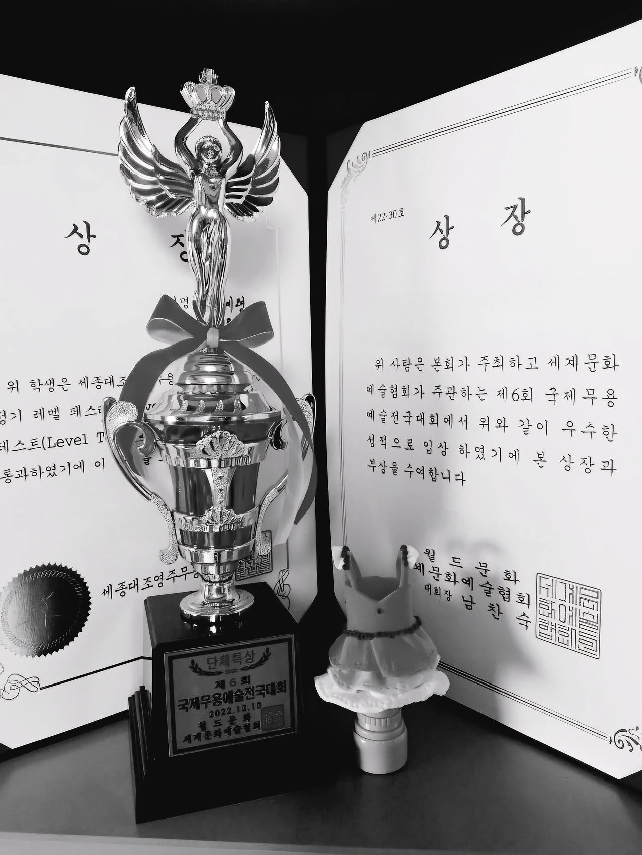 내 이름을 확인하는데 내 이름이 옆에 만점 가까운 점수에 대상이라고 적혀 있는 게 아니겠는가.... 나는 너무 기뻐서 어쩔 줄 몰라 했다. 언니들도 우리 부모님도 다른 학부모들도 기뻐해주었고 축하해주었다. 내가 욕심이 많아서 틈만 나면 연습에 몰두했고 심사위원을 포함해 관객들이 봤을 때 내가 느끼는 감정을 그들도 똑같이 느낄 수 있도록 감정표현을 잘 살릴 수 있게 꼼꼼하고 세밀히 연구하고 노력했다. 내가 할 수 있는 모든 노력을 한 터라 점수를 관여하지 않았고 오직 최선을 다한다는 신념만을 가지고 충실히 임했었다. 항상 군무작품을 나가서 수상을 하면 언니들이 트로피와 메달과 상장을 받았는데 사실 나는 만지지도 못했다. 그때 처음으로 시상식때 내 이름이 호명되면서 트로피와 메달을 받고 상금과 상장을 부여받았다. 대표와 악수를 하고 사진 찍고 걸어 나와서 부모님을 비롯해 무용단원들과도 사진을 찍었다.