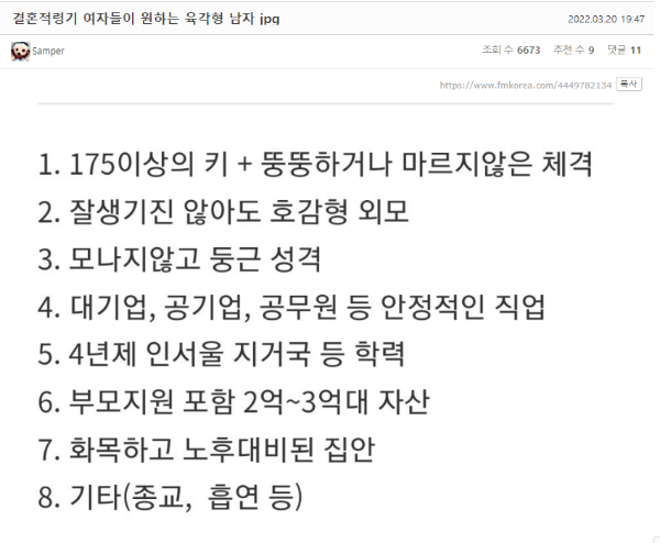 최근 커뮤니티에서 (결혼정보회사에서 선호하는) ‘육각형 남자’라는 단어가 유행이다. 역삼각형 몸매의 남자도 아니고 육각형 남자? 수학 잘하는 남자를 말하는 건가? 찾아보니 위 조건들을 고루 갖춘 남자를 흔히 '육각형 남자'라 부르고, 이 육각형 남자를 결혼 적령기 여자들이 선호한다는 것이었다. 외모면 외모, 학력이면 학력, 직업이면 직업, 자산이면 자산… 과연 현실에서 이 육각형을 가진 남자가 얼마나 있을까. 대부분 사람들이 찌그러진 육각형을 갖고 있을 텐데. 혼인율이 떨어지는 이유를 수긍하게 해 준 육각형 이론이다.