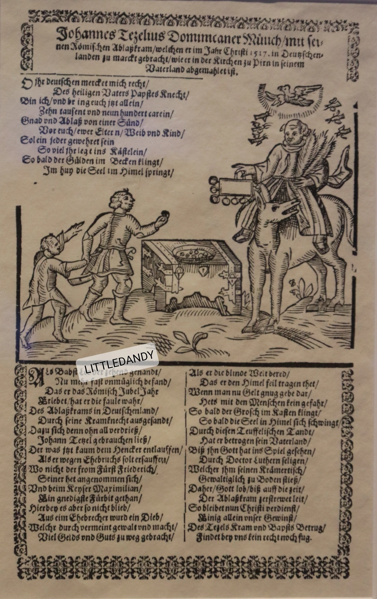 나귀를 탄 텟첼 수도사가 한 손에는 교활함을 의미하는 세 개의 여우 꼬리를,