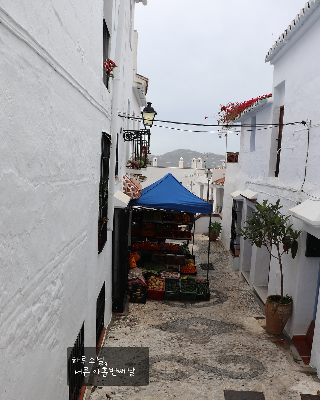 흰색 회반죽으로 벽을 바른 이층집들 사이로 흐르는 좁고 꼬불꼬불한 길을 서성이는 모습이,