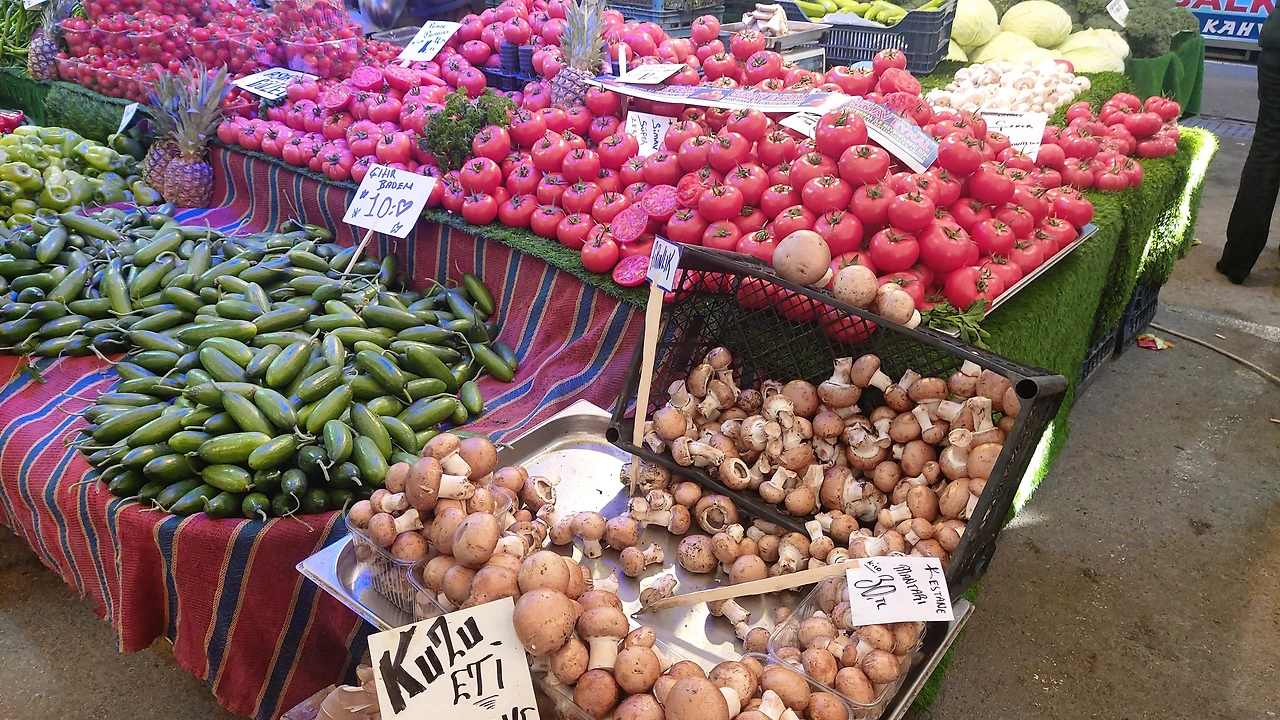 시장에서 가장 많이 파는 품목은 채소와 과일이고 당근, 오이, 고추, 파 등 우리나라와 비슷한 식재료들도 많다. 다른 점은 배추, 무, 깻잎, 각종 버섯을 보기 힘들고 토마토, 올리브와 파슬리, 딜, 민트 등 각종 허브가 종류별로 가득한 매대를 볼 수 있다는 점이다.