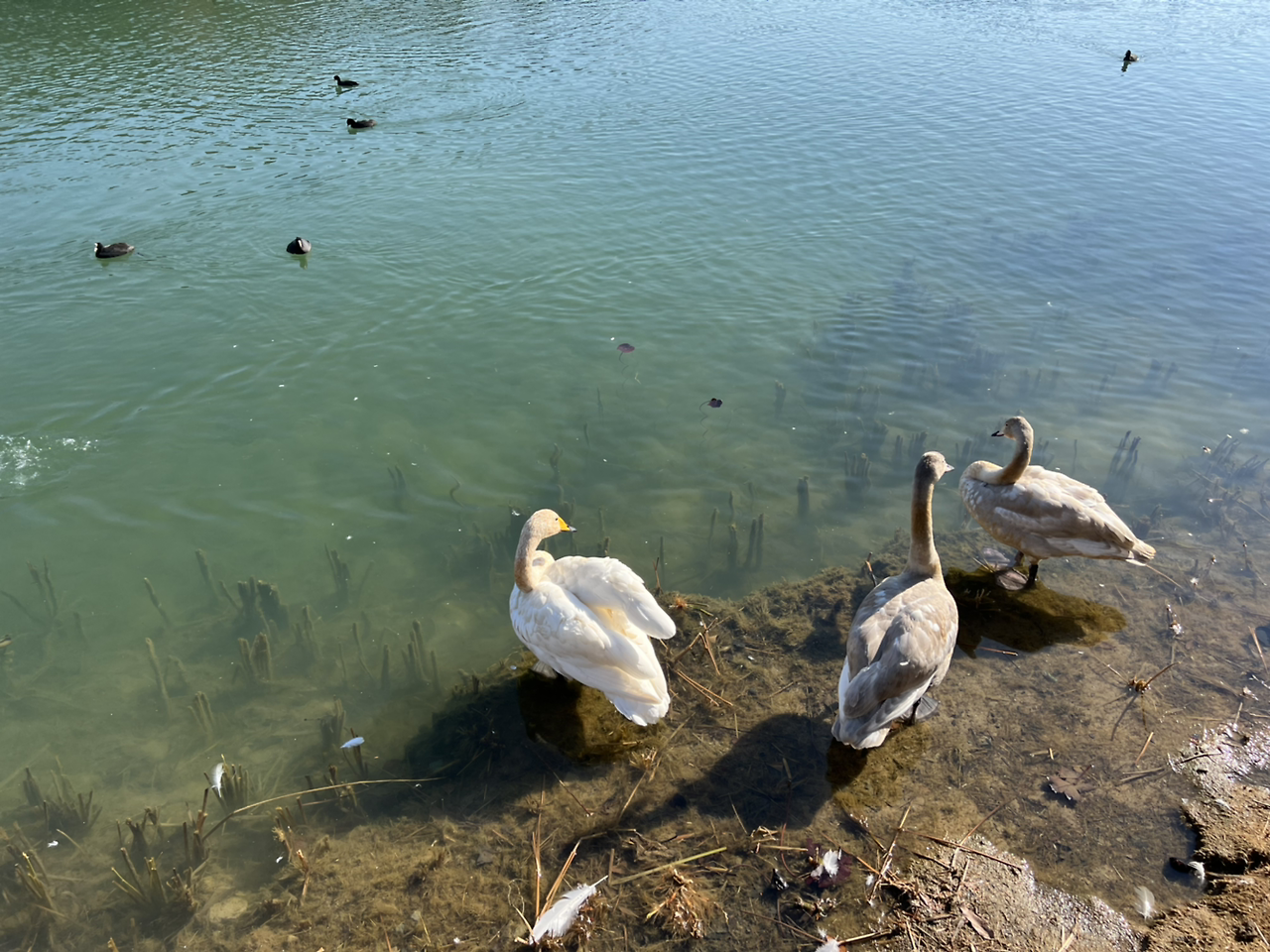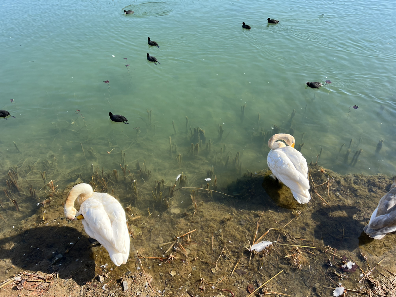 물론 겨울철에 눈 대신 따듯한 곳을 찾아 머무는 철새들이 있습니다. 그러니까 눈 대신 귀엽고 멋지고 저 마다의 표정이 있는 철새를 구경하는 재미와 멋도 있어요. 창원의 겨울은요. 아래 사진 속 새들은 제 동네 호숫가에서 겨울을 나려 온 철새들입니다. 흰 고니, 회색깃털 고니는 어른이 되기 전의 어린이 고니라고 보시면 되고요. 동네 아이들이 던져주는 새우깡을 무척 잘 먹더라고요. 겨울을 지내고 다시 떠날 때 즈음에는 하얗고 빛나는 흰 고니가 되겠지요.