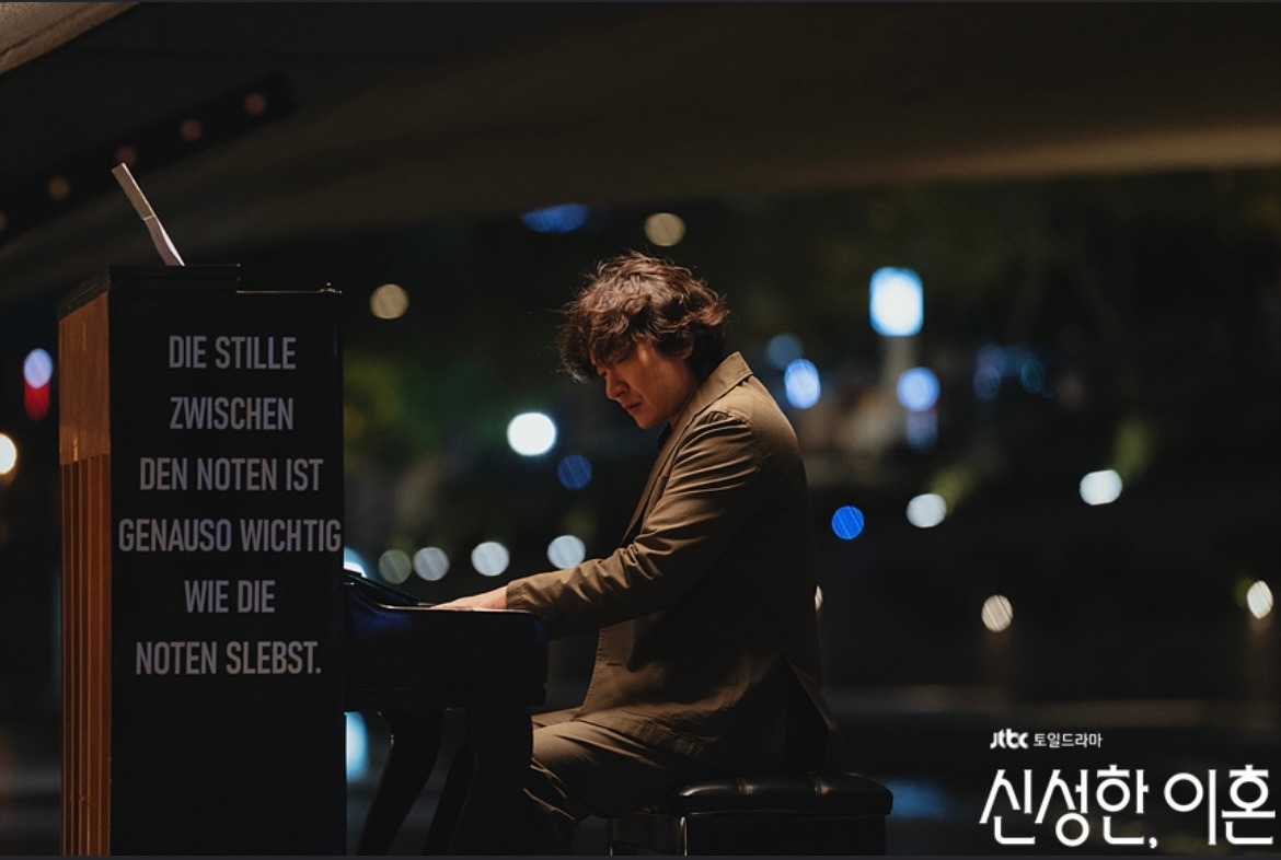 <신성한, 이혼>은 카카오페이지에 연재 중인 웹툰을 원작으로 하는 드라마다. 재미있는 설정은 조승우가 독일 유학을 떠났던 피아니스트이자 독일에서 교수로 활동했다는 점이다. 고급 와인잔에 소주를 따라 디켄팅하는 모습, 나훈아의 <테스형>을 구성지게 부르는 모습 등이 왠지 독일 유학파 피아니스트이자 교수로 활동했던 사람의 이미지와 어딘지 상반되는 느낌도 들어서다. 물론 이 또한 클래식 연주자들에 대한 고정관념일지도 모르겠다. 클래식을 공부했다고 해서 우리 전통의 음식과 문화를 즐기지 않는다는 것이 말이 안 되는 소리인데도 말이다!