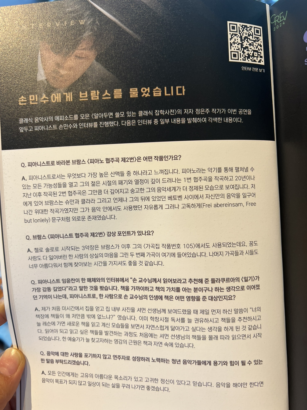 정말 저는 손민수 선생님 완전 평생 팬이에요. 통영과 서울에서 두 번의 브람스를 듣고 더 더욱! 또 인생 네 컷 마지막 사진을 보자마자 제 입에서 “민수 오빠..” 작게 읊조리는 걸 들으신 한 관객분이 빵 웃으셔서 좀 챙피했습니다. 그리고 제 앞 앞 줄에 윤찬군 앉아서 신기했어요. 담에 직관해보고 픈 연주자!) 하핫.