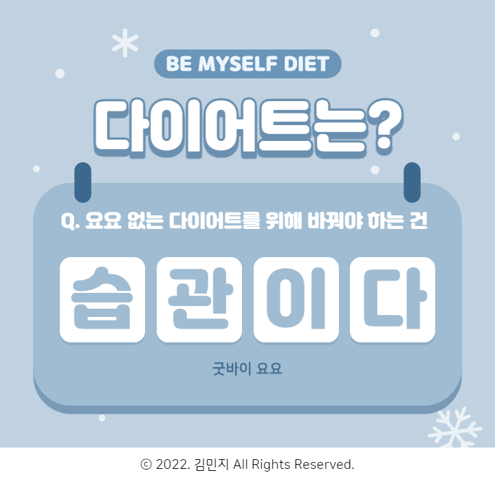 맞아요. 다이어트는 습관입니다. 습관을 바꾸지 않으면 결국, 요요를 반복할 수밖에 없어요. 건강하게 먹고, 운동을 즐기는 게 내 일상의 습관이 되어야, 다이어트로부터 영원히 자유로워질 수 있으니까요. (= 자신을 건강하게 관리할 능력이 생긴다는 것)