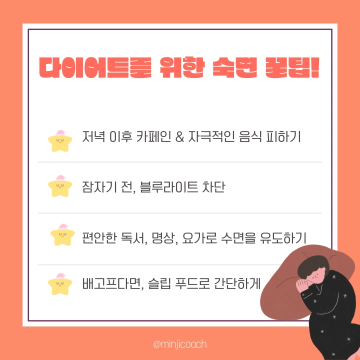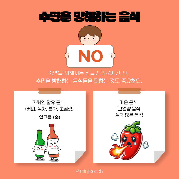 숙면을 위해서는 잠들기 3~4시간 전, 수면을 방해하는 음식들을 피하는 것도 중요해요.