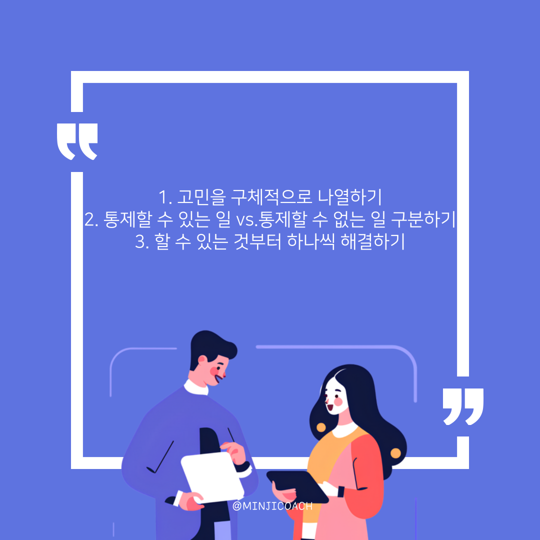 그러니 지금 마음이 복잡하고 무엇부터 해야 할지 막막하다면, 먼저 나의 고민을 구체적으로 나열해 보세요. 그다음, 통제할 수 있는 것과 통제할 수 없는 것을 나누어보고, 마지막으로 지금 당장 할 수 있는 것부터 하나씩 해결해 보세요.