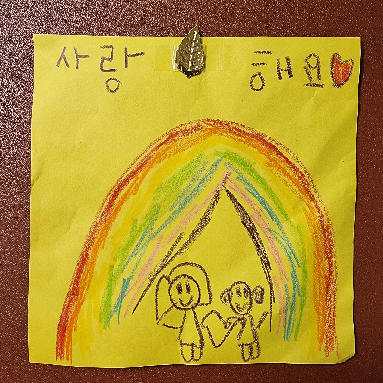 “오, 오, 오. 엄마가 제일 좋아하는 무지개네. 어머나, 오늘은 금색 나뭇잎도 붙였어. 엄마 스타일이야. 아잉, 엄마랑 너랑 같이 하트를 만들고 있는 모습이네. 꺄, 사랑스러워.”