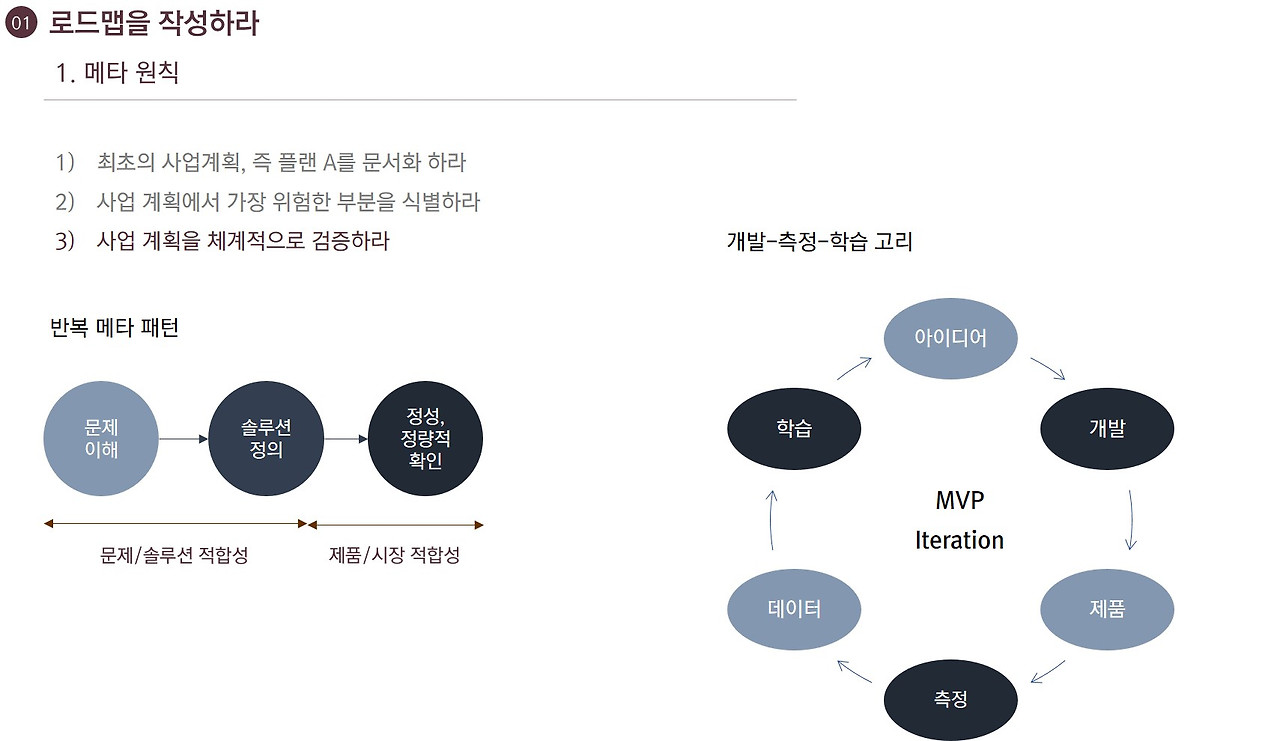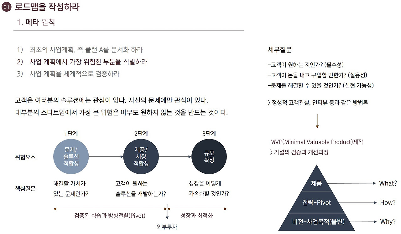 이 MVP를 가지고 고객 테스트를 통해 우리가 검증하고자 했던 유의미한 데이터를 뽑아낸다. 그리고 가설 검증을 통하여 우리가 생각한 대로 제품과 서비스가 구현되는지 학습한다. 학습한 내용을 반영하여 다시 제품/서비스 개발을 진행한다. 이러한 과정을 끊임없이 반복하여 최적의 제품을 만들어 내는 것이 린 스타트업이다. 린 스타트업에서는 처음부터 금형을 만들 생각을 하지 않아도 된다. 제품 테스트를 통해서 최적의 제품이 검증되면 그 이후에 양산체제를 갖추면 된다. IT서비스도 랜딩페이지와 같은 가벼운 툴을 통해서 고객에게 먼저 콘셉트와 기능에 대해 피드백(베타 서비스)을 받은 후 수정하여 정식 서비스를 론칭하면 된다. 개념적으로는 당연하게 여겨질지 몰라도 실제로 이 프로세스를 적용하여 사업을 진행하는 것은 상당한 실행력과 분석력을 수반한다.