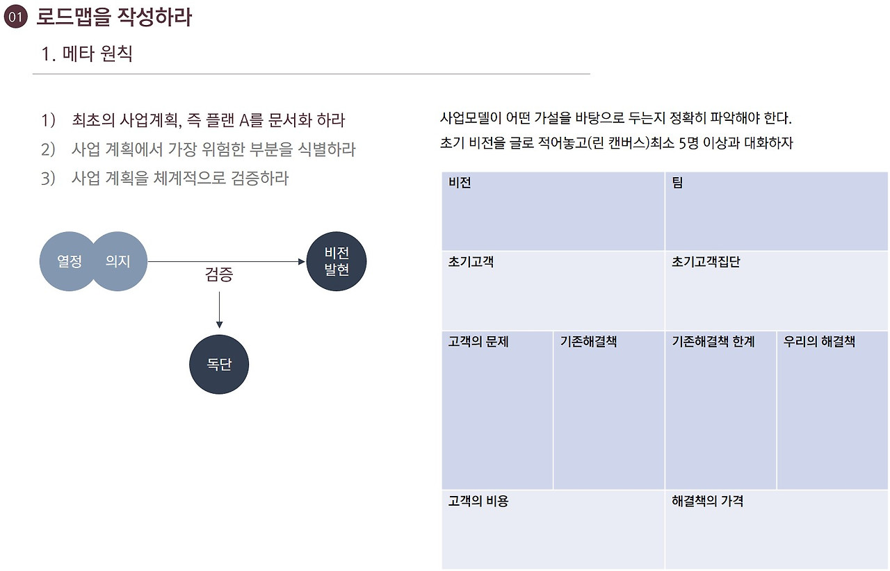 린 방법론의 첫 번째는 최초의 아이디어를 문서화하는 것이다. 이때 사업획서를 작성하듯 거창하게 적는 것이 아니라 간단하게 핵심적인 내용들만 정리해 놓으면 된다. 싸이월드 창업자인 이동형 대표가 제안한 서바이벌 캔버스(위의 표)를 추천한다. 그리고 이것을 5명 이상의 사람들과 대화하며 각 항목에 대한 객관성을 검증한다.